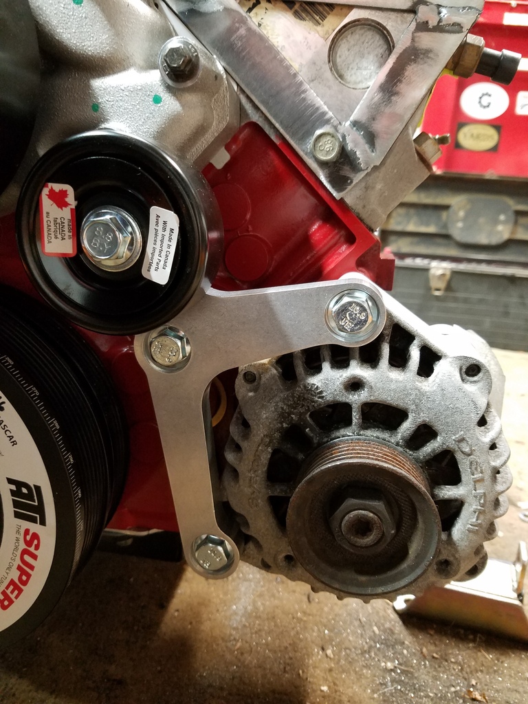 I decided to drop the idea of a DIY alternator bracket. Once I figured I'd need to get the spacing correct, and then work in the belt pulley as part of it, I wasn't sure if it made sense to fab it up myself and make it sturdy enough to not flex, etc. I looked around online and found an affordable bracket kit that was designed for the Corvette crank pulley spacing.