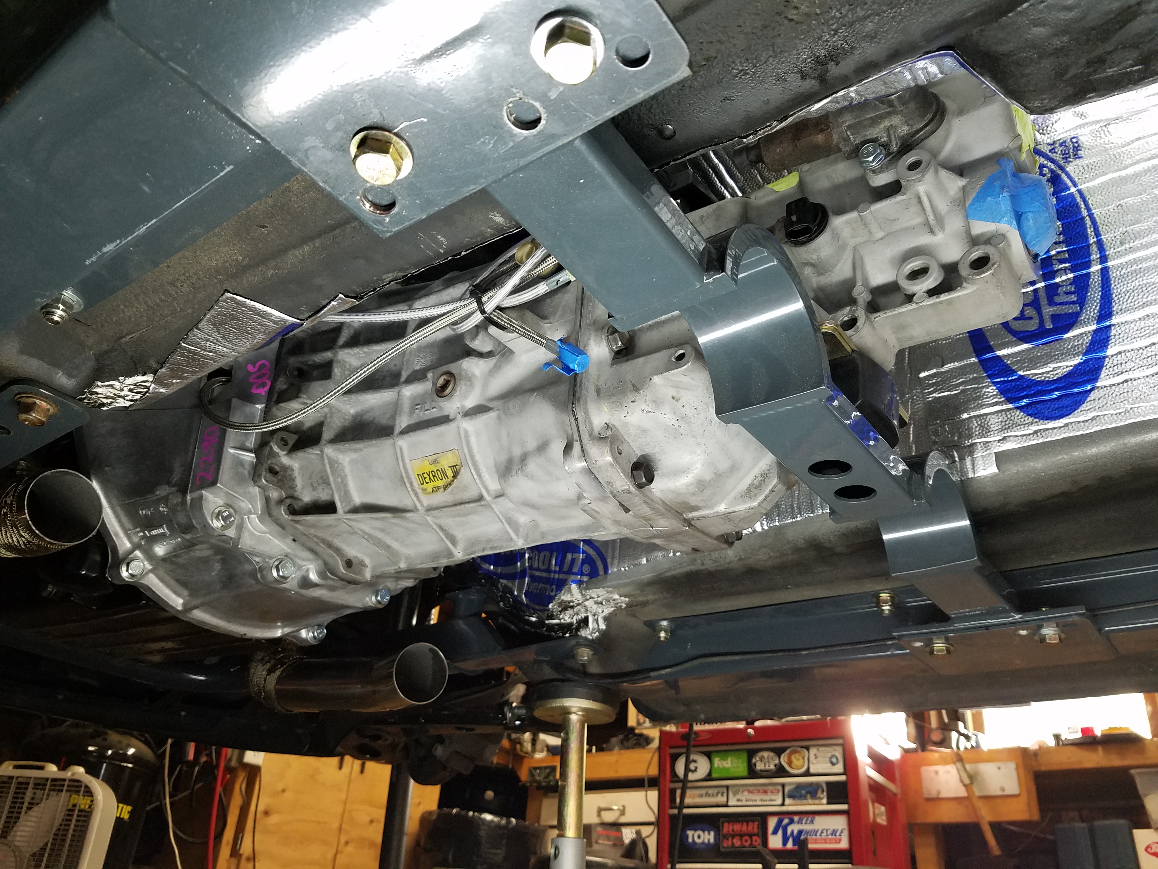 Finished the day by installing the trans cross member and then the frame rails so they lined up with the cross member. This part of the job flew by so that by end of a productive day I had a full installed trans and I could take a break from working on my back under the car.