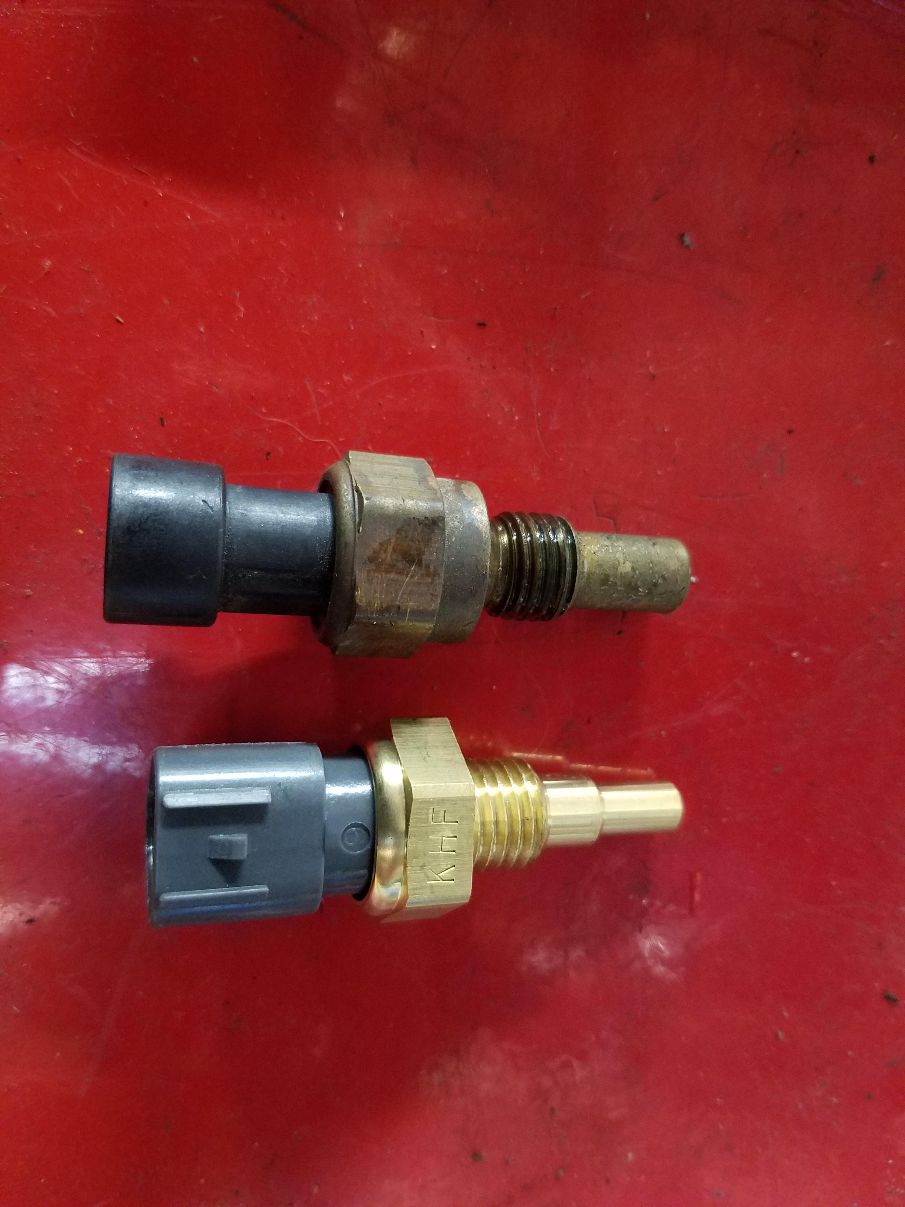 Installed a new Miata coolant sensor which conveniently threads right into the same port as the LS1 sensor. Here are the two side by side. I've been told (thanks wcw5023) you will still need to run the LS1 sensor for the PCM to be happy, but the Miata sensor will feed your dash gauge for the correct temp. There is another water temp port at the back of the passenger side head.