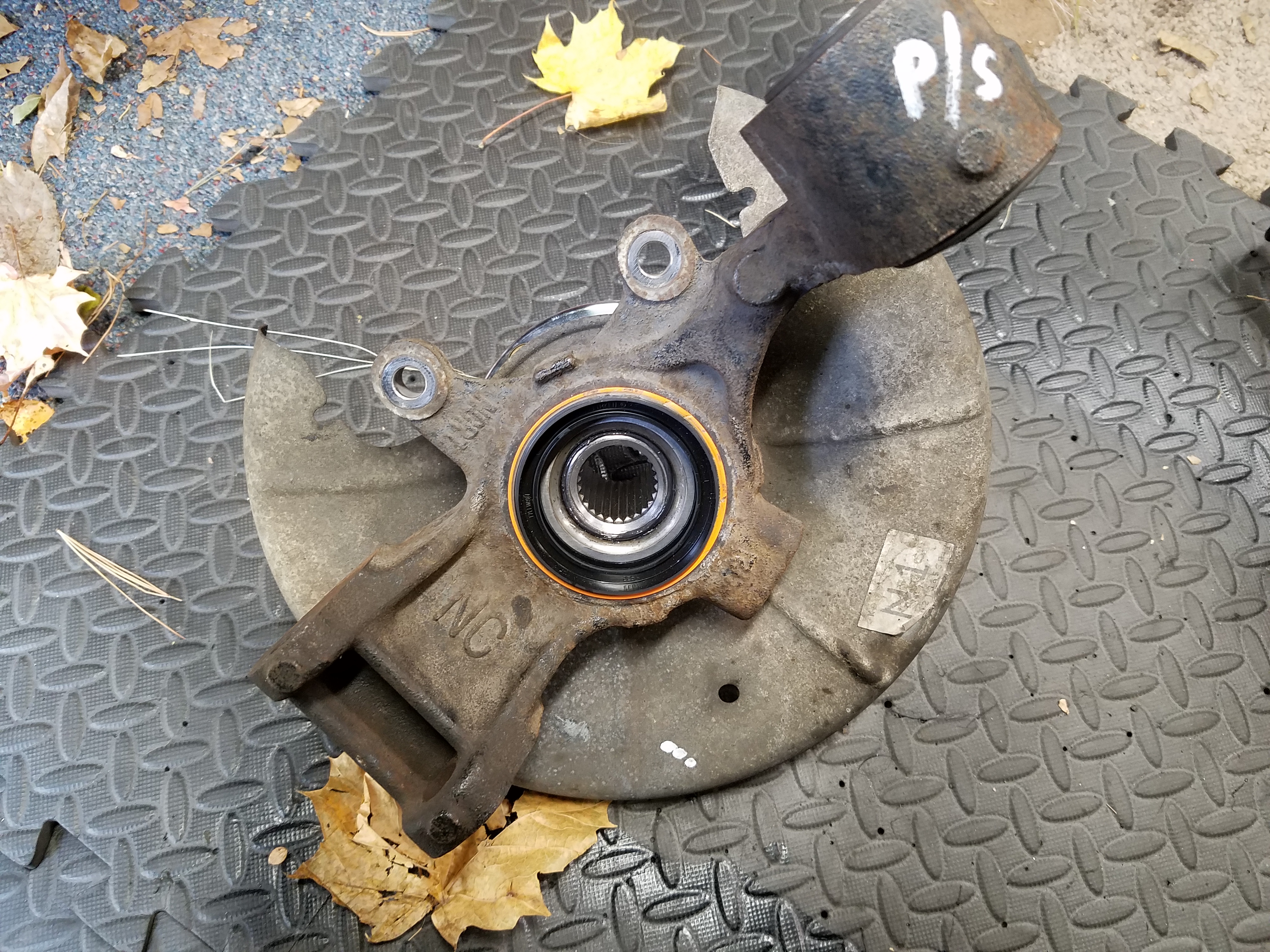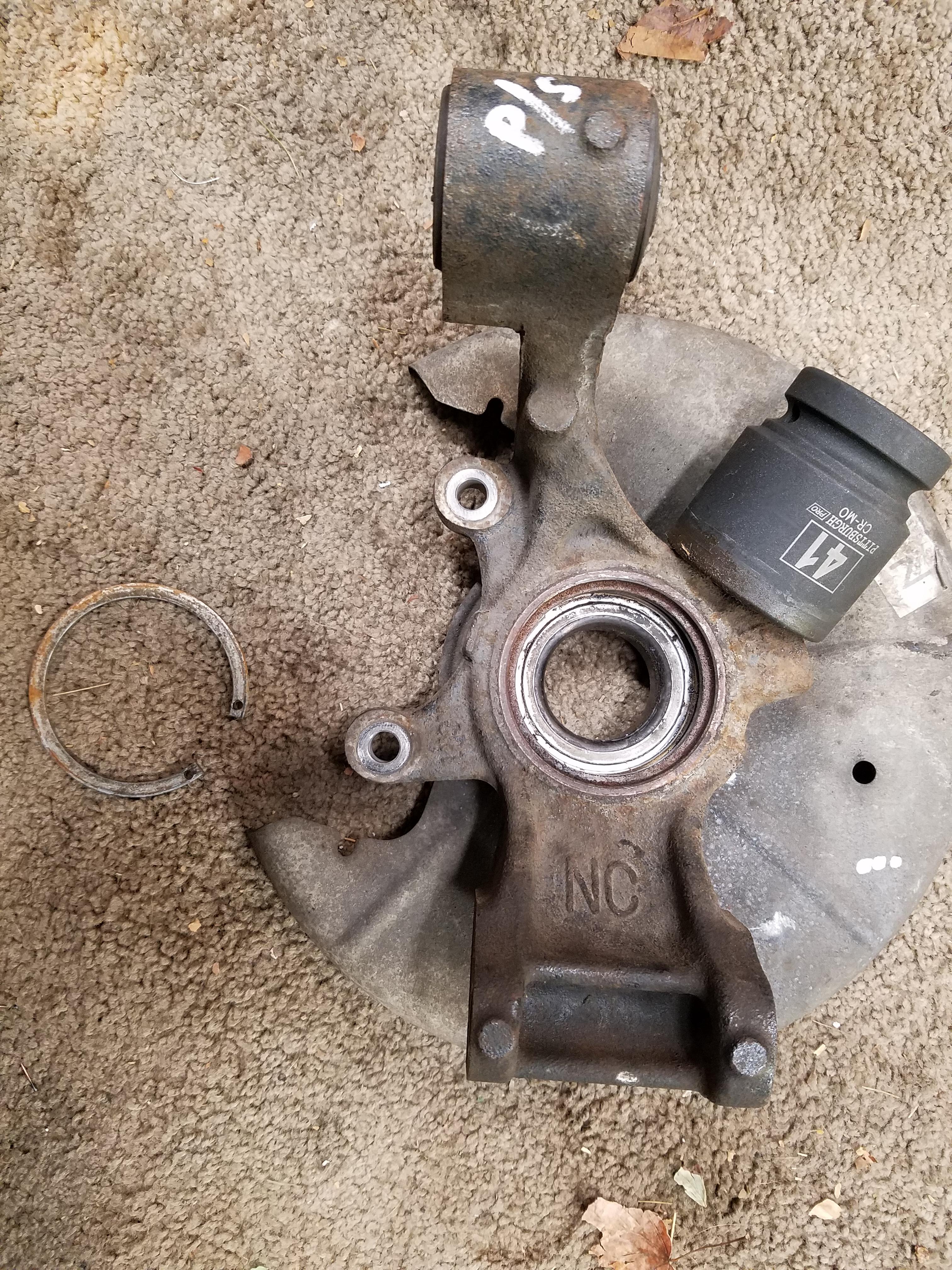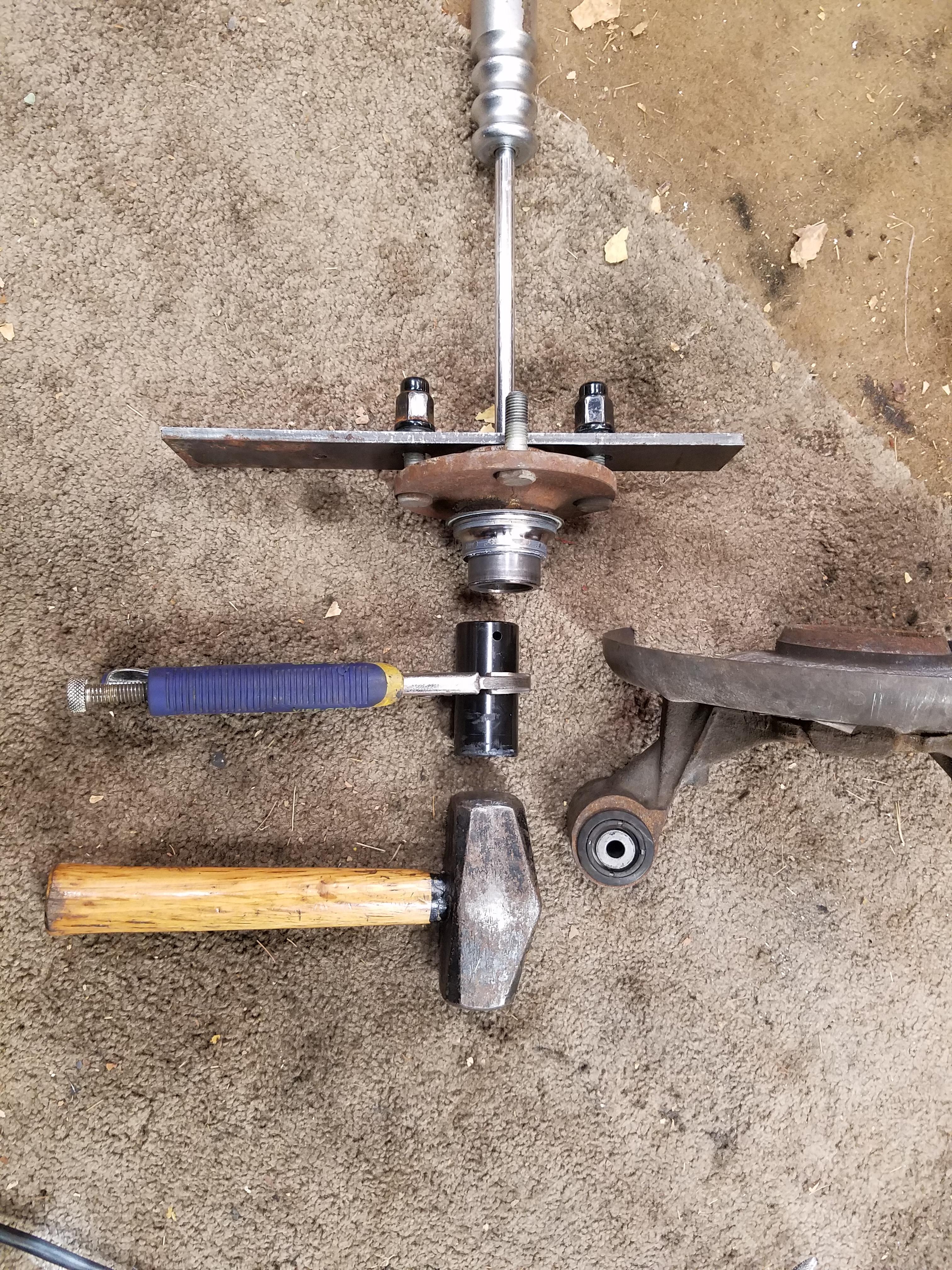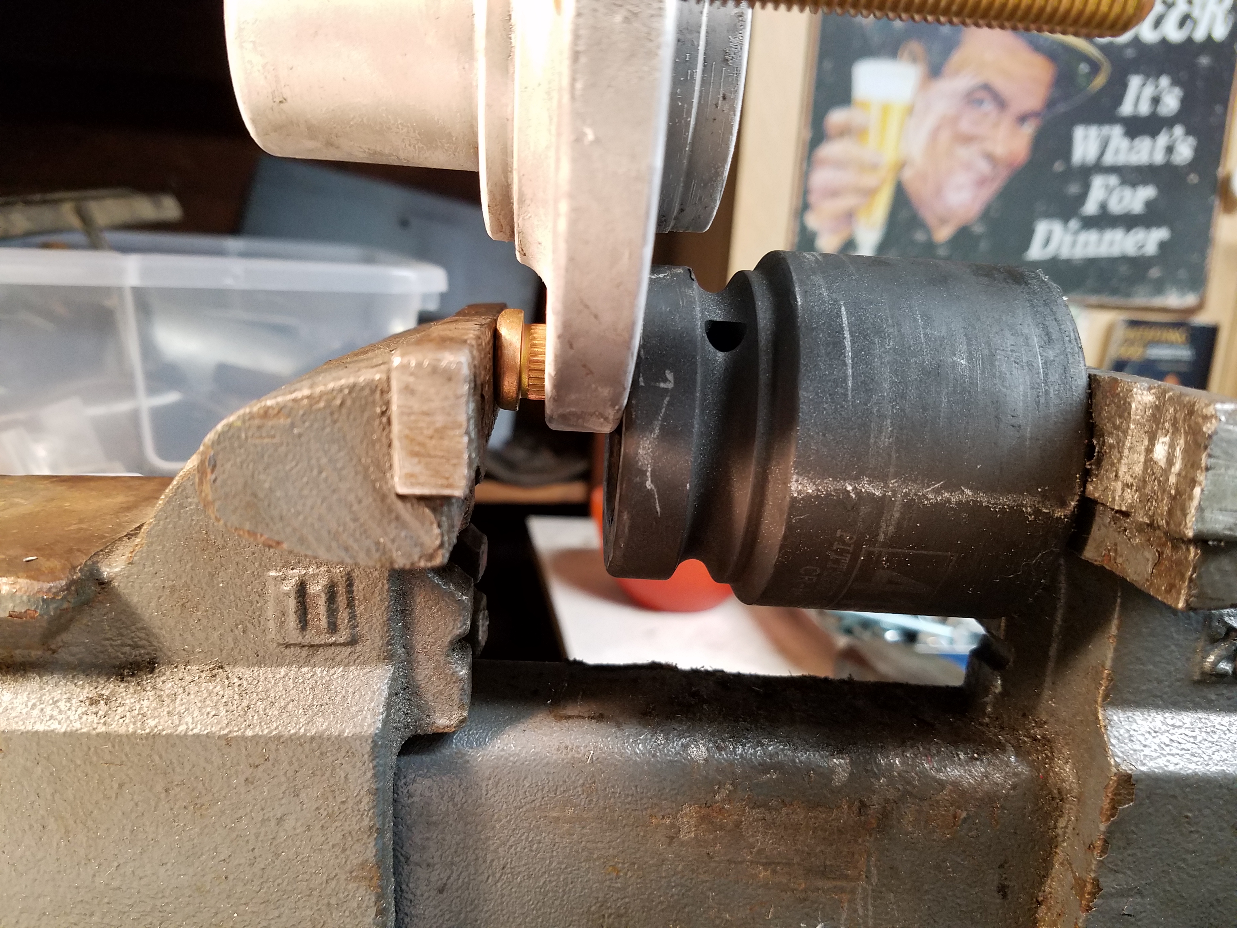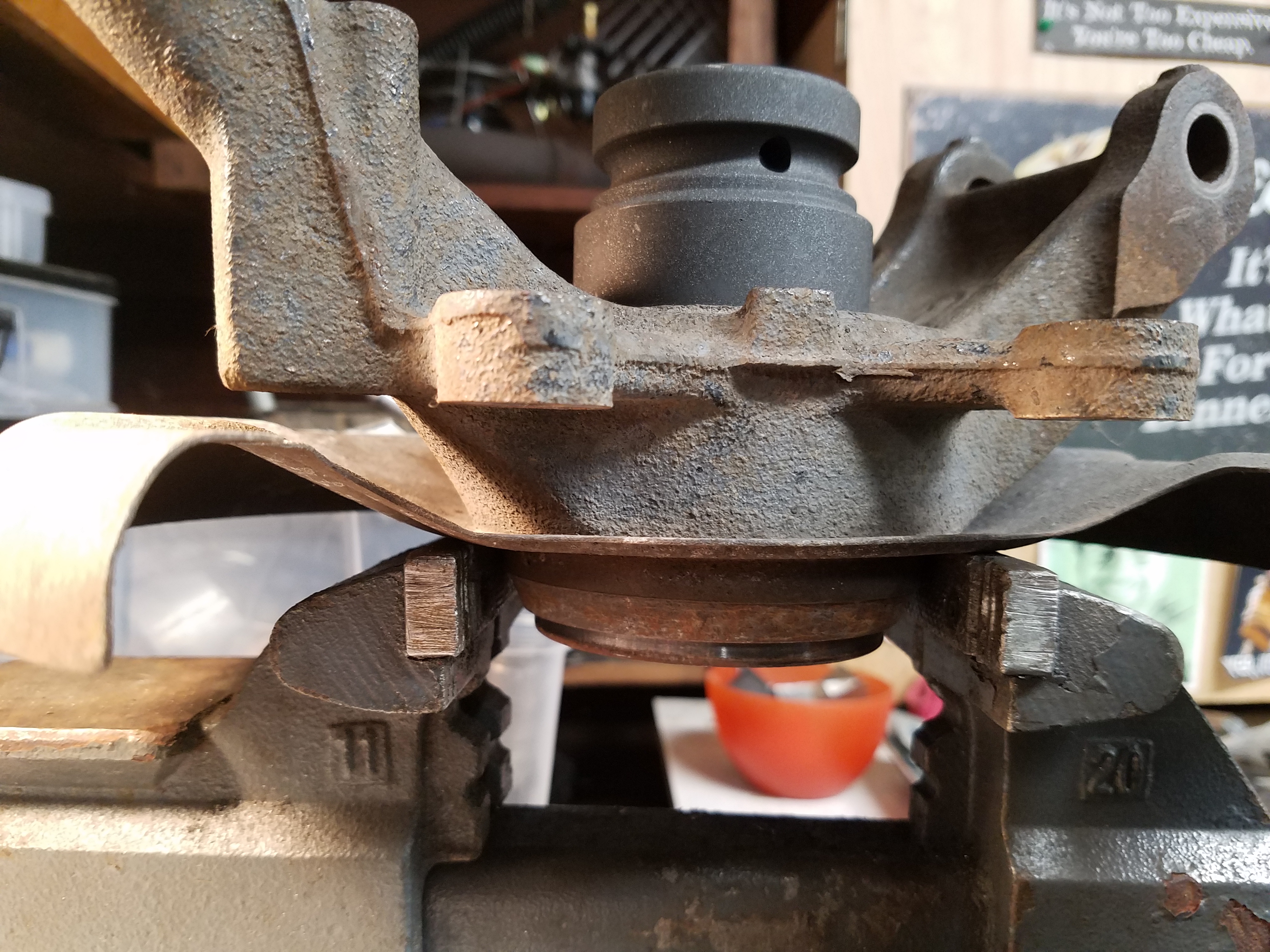 This is how I broke the spindles down. First tried with a slide hammer, but after awhile I realized that was going to be pointless. I'm not reusing these, so don't care how hard I beat on them. So the pic shows my drilling hammer hitting an appropriately sized impact socket. I hold the socket with a vise grip against the hub and wail away at it until it pops out.