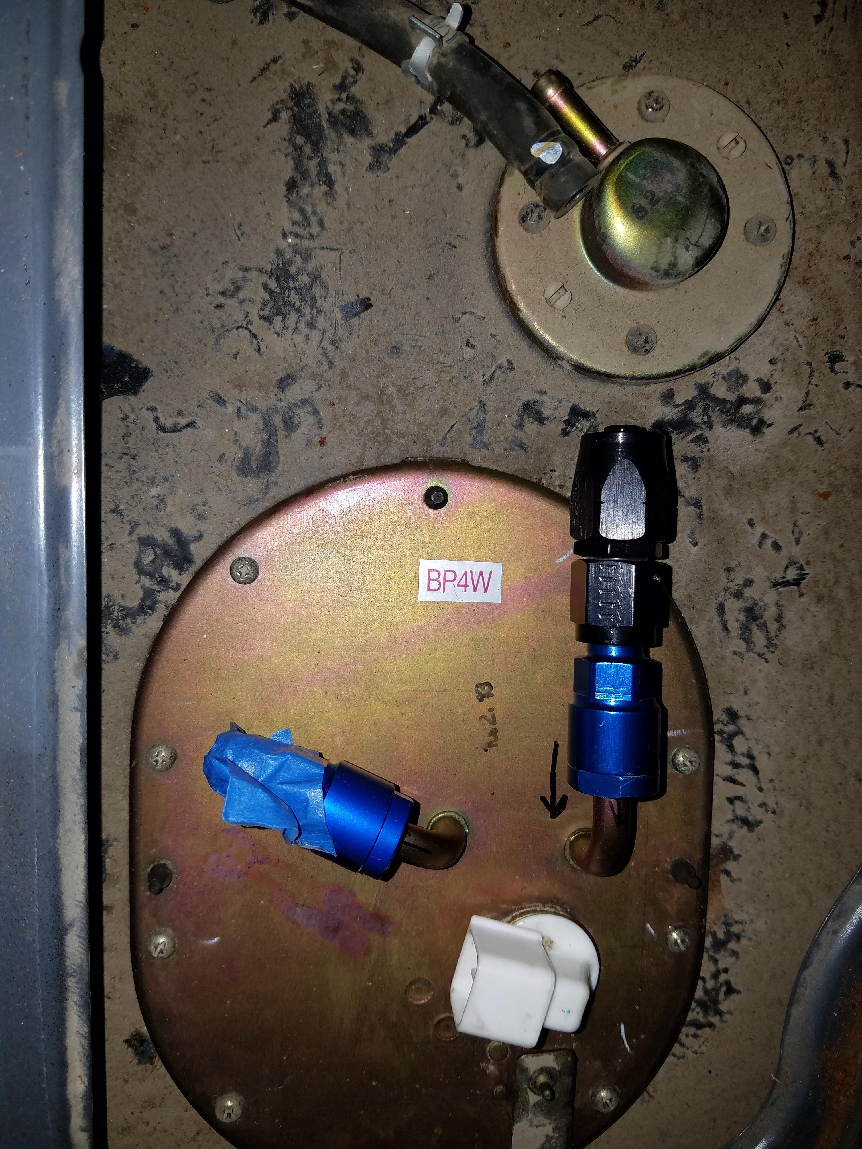 Put the assembly back in the tank and attached the blue fuel adapter fittings you see to make them into a -6 AN connection.