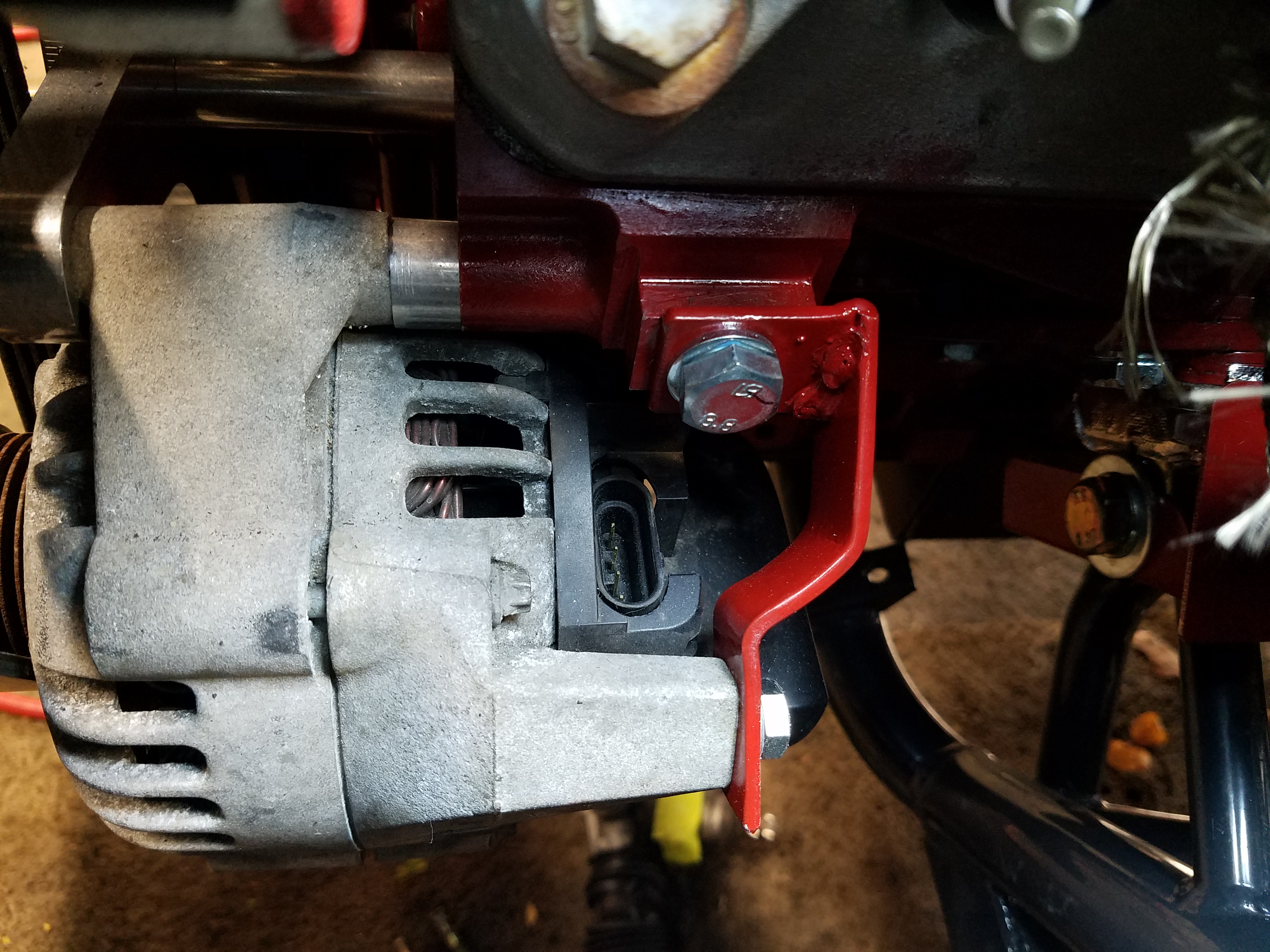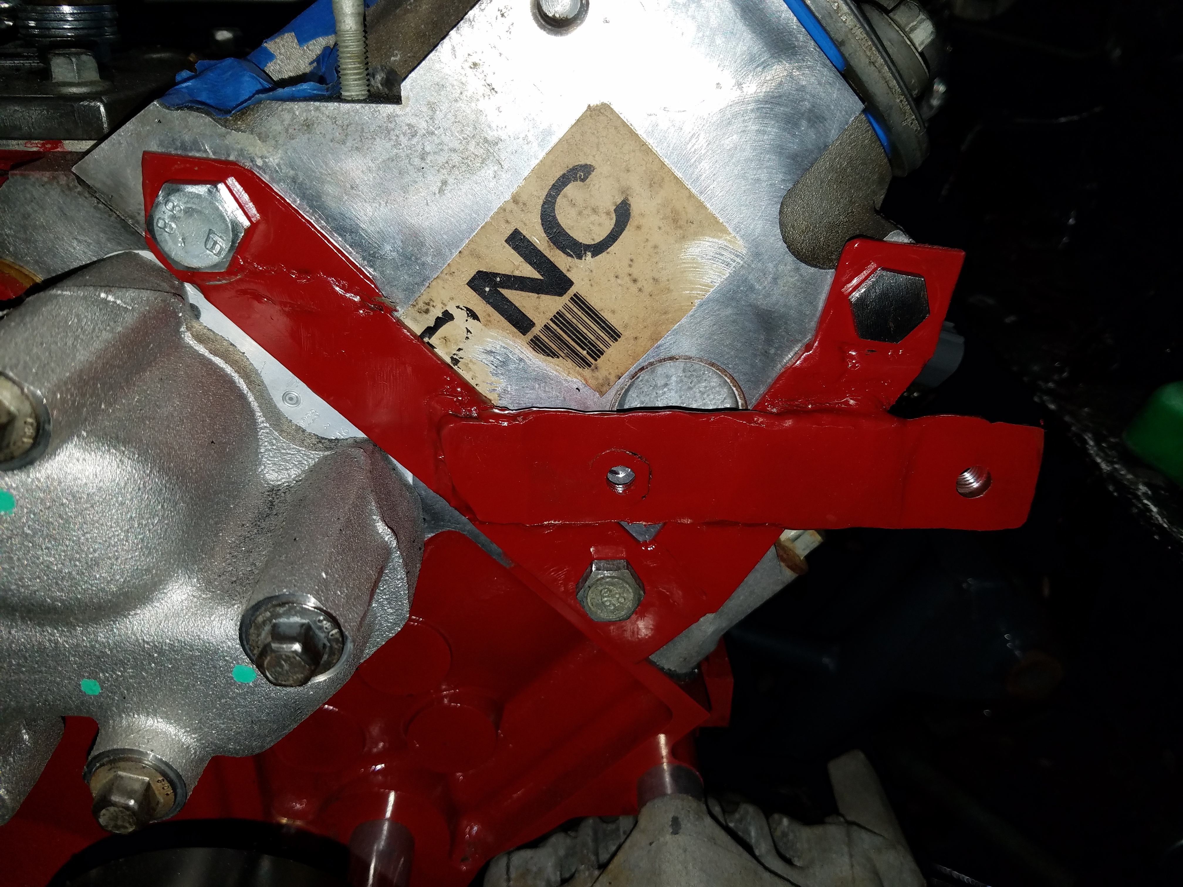 Finished up the power steering pump bracket. I just hit it with some matching red spray paint the day before and bolted it up. It's not the prettiest thing but seems to very solidly mount the pump where I need it.