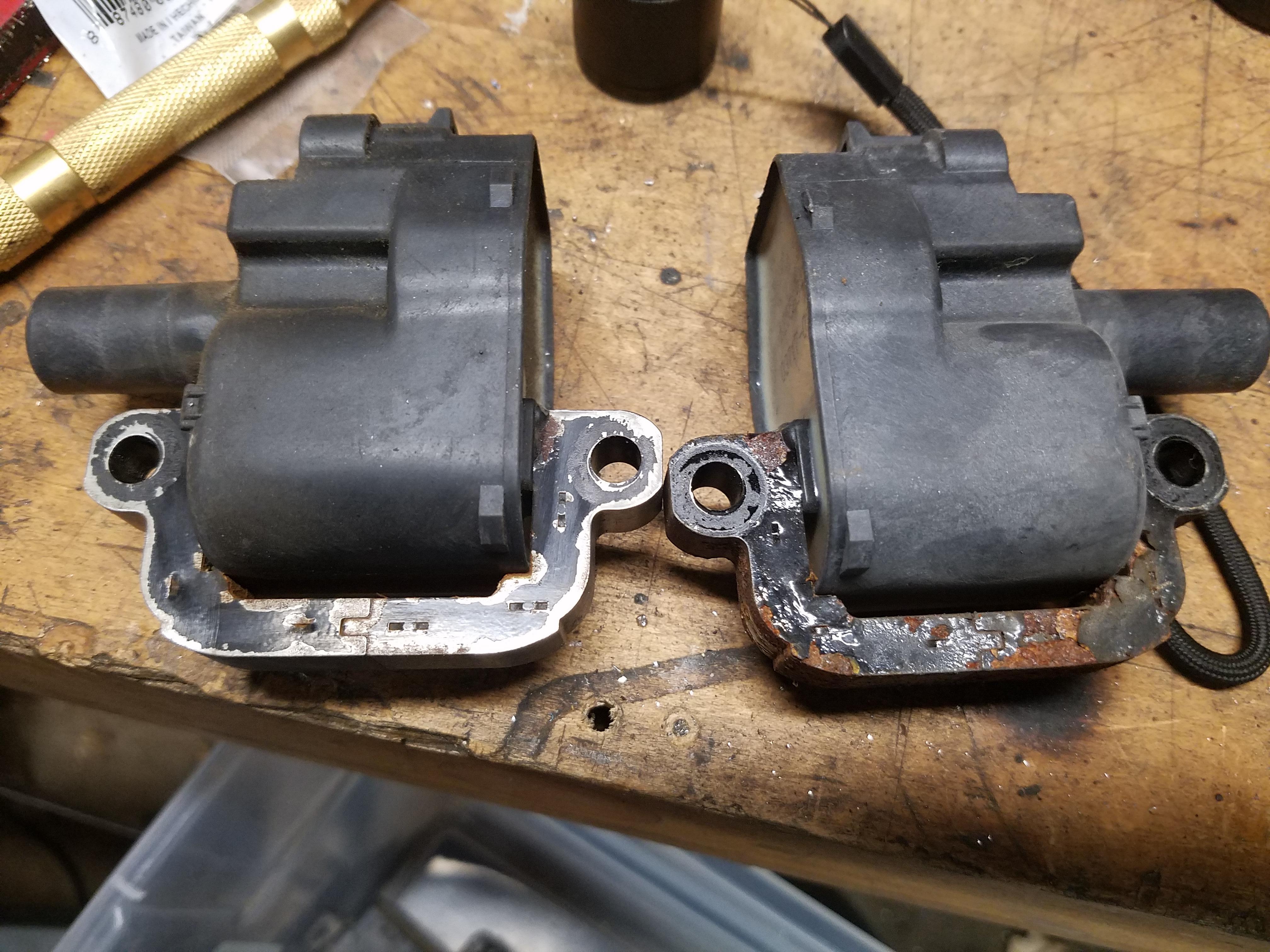 Decided to clean up the rusty/flaky coil pack brackets. Hit it with the wire wheel and then brushed on some rust preventer stuff I had laying around. Rusty on the right, wire wheeled on the left.