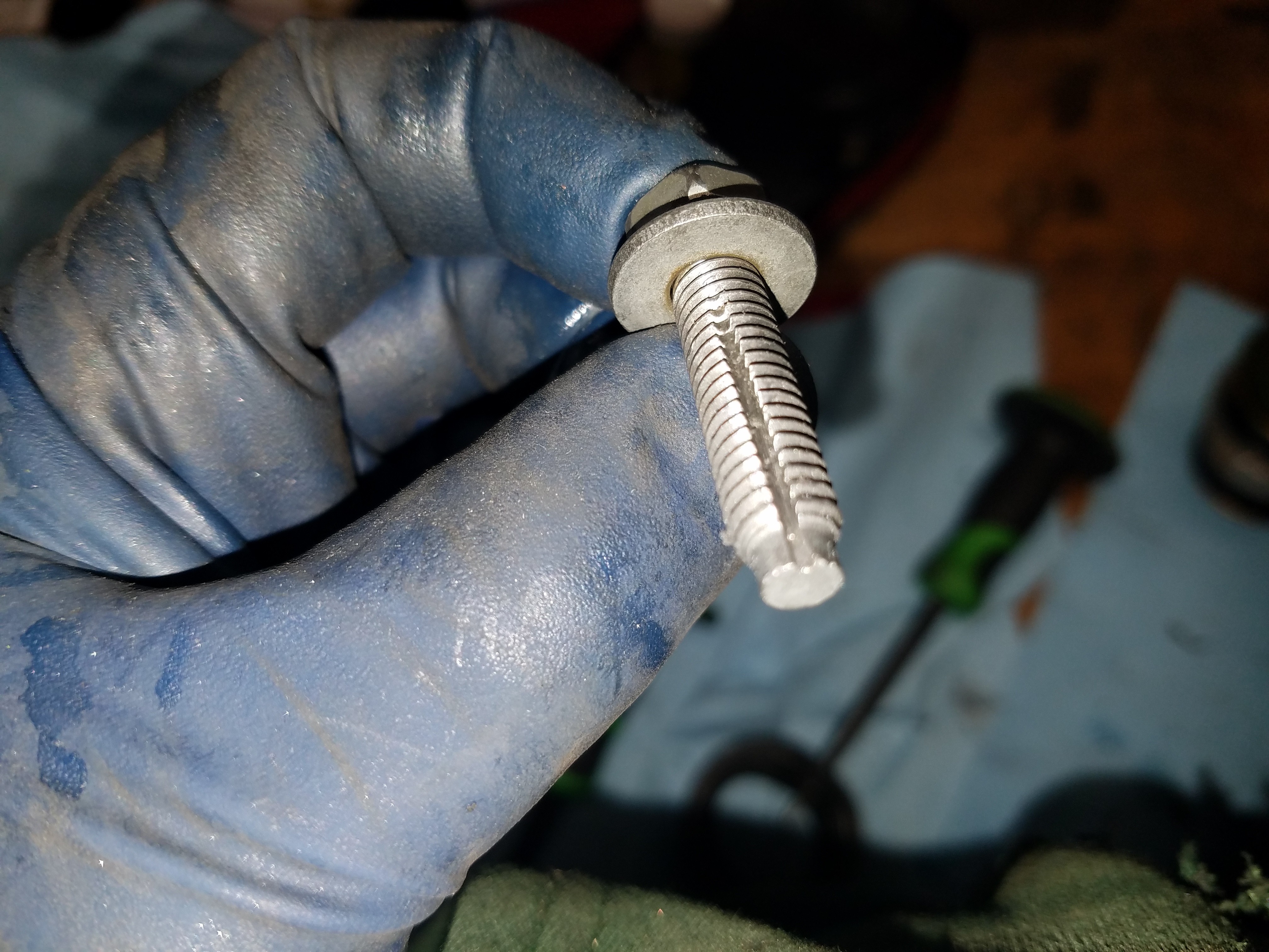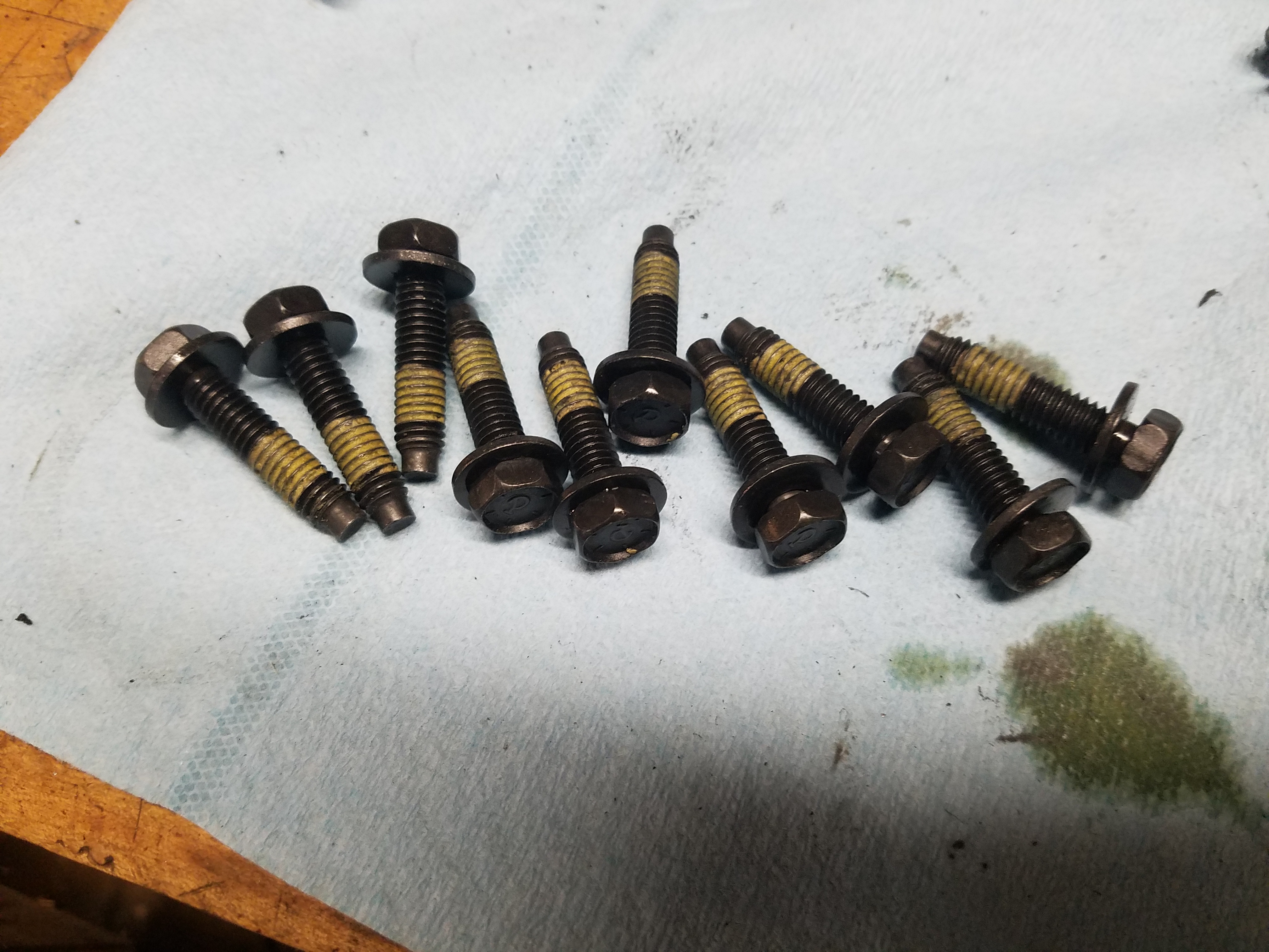 Cut a slit down one of the old bolts to make my own thread chaser as some silicone (mix of black, probably RTV, and clear silicone was in the bolt holes) to clean it up