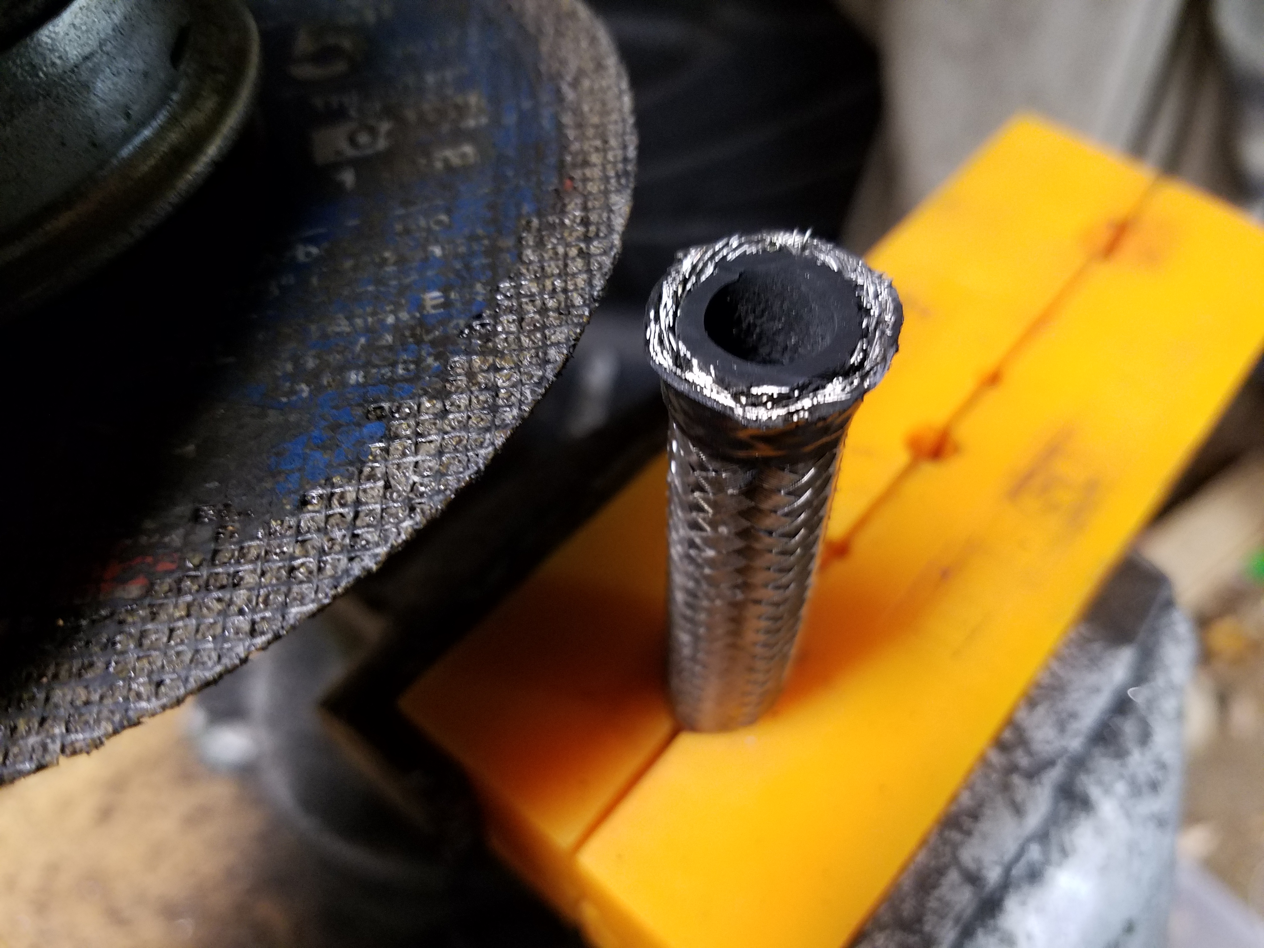 I wrap the hose in electrical tape with a few tight wraps around. Then I use a metal cutting blade on my grinder, a thin one if possible, and make a cut around the hose. I try not to just cut the hose in one pass, but make about 4 cuts into the hose at around 90 degrees to each other. This prevents the braided material from fraying too much based on the way the blade cuts through it. Hope that makes sense.