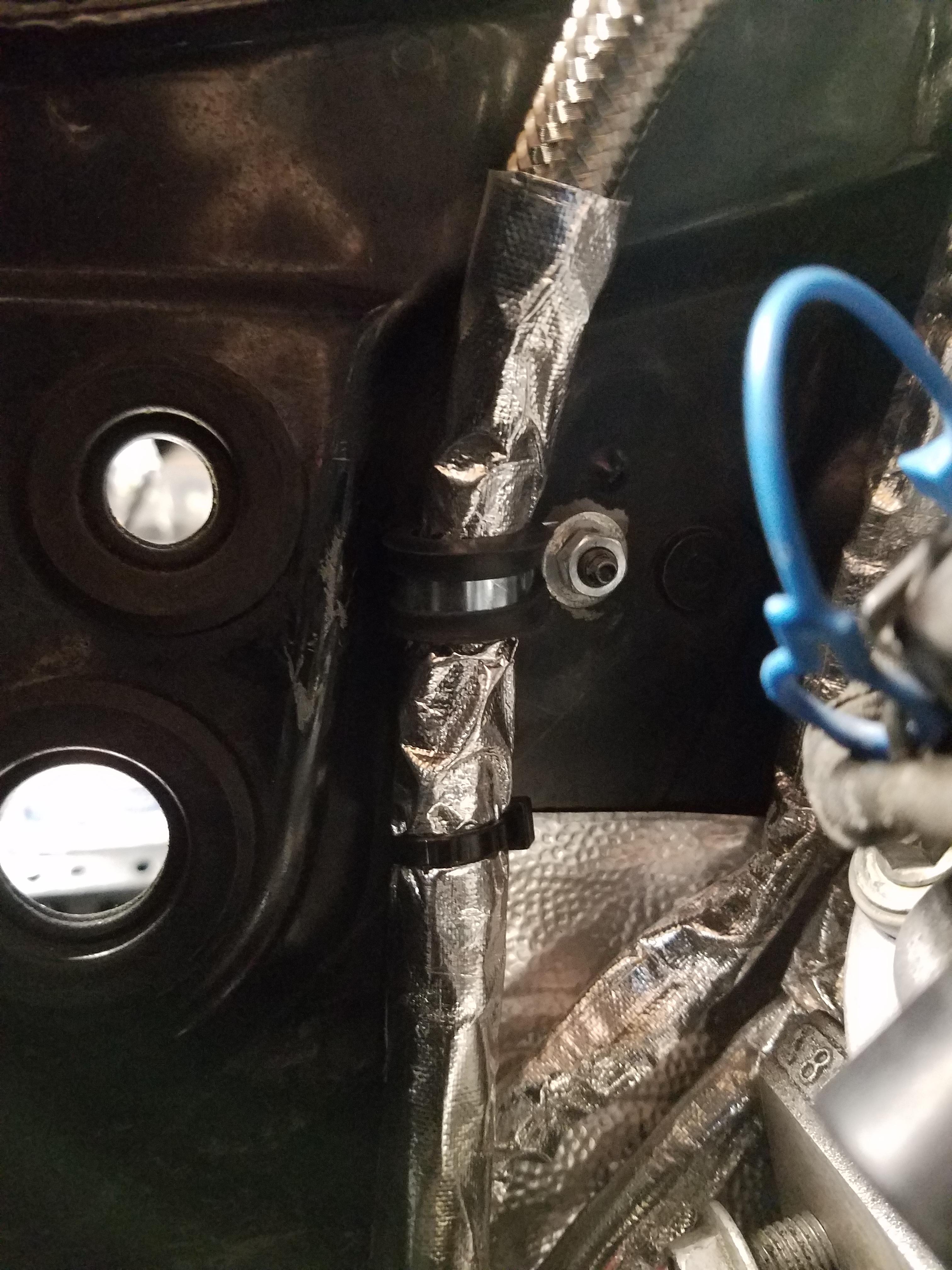 Covered the fuel hose near the engine with some more heat wrap. Found a convenient stud on the firewall to use a padded clamp to hold the hose in place