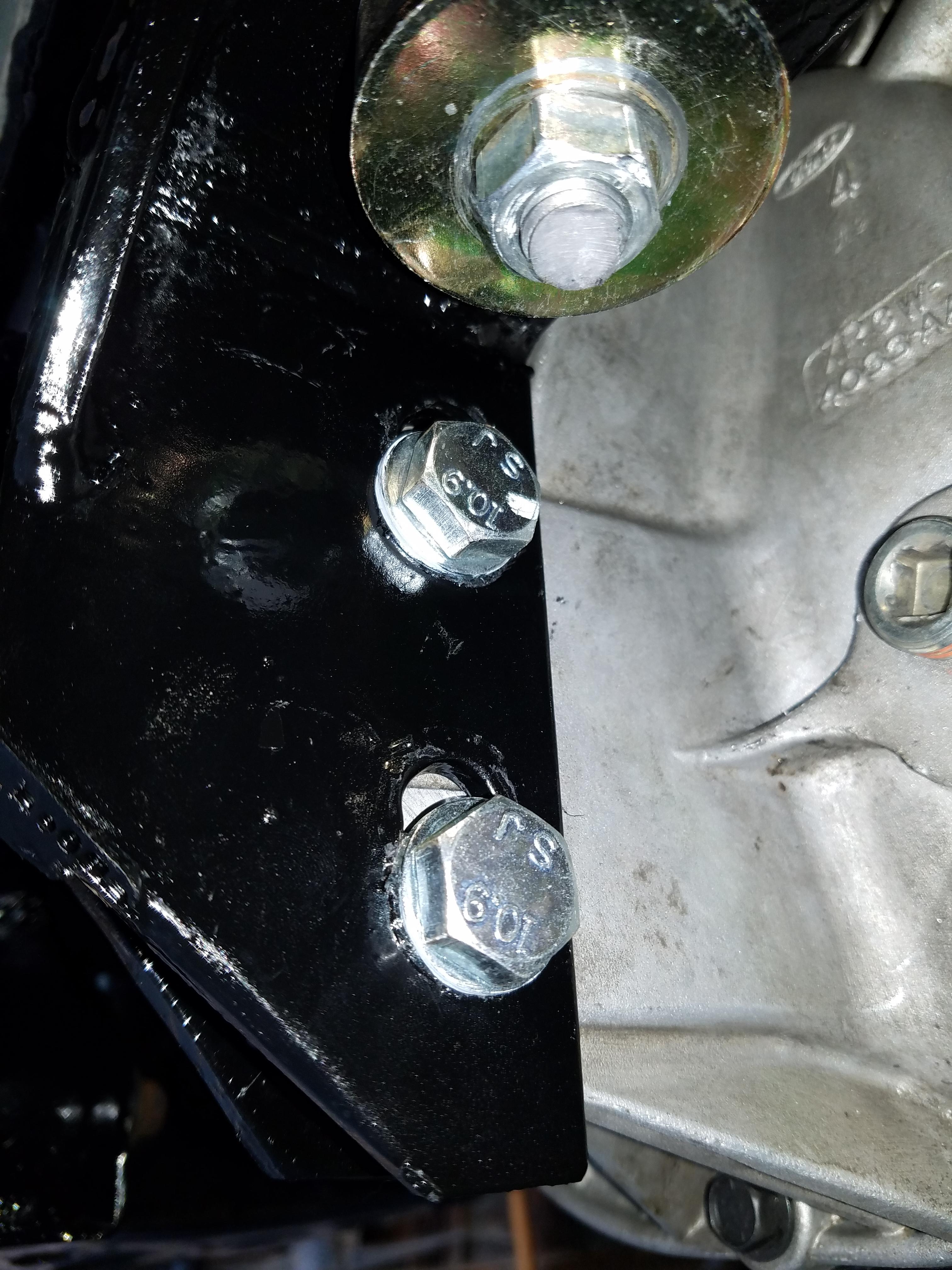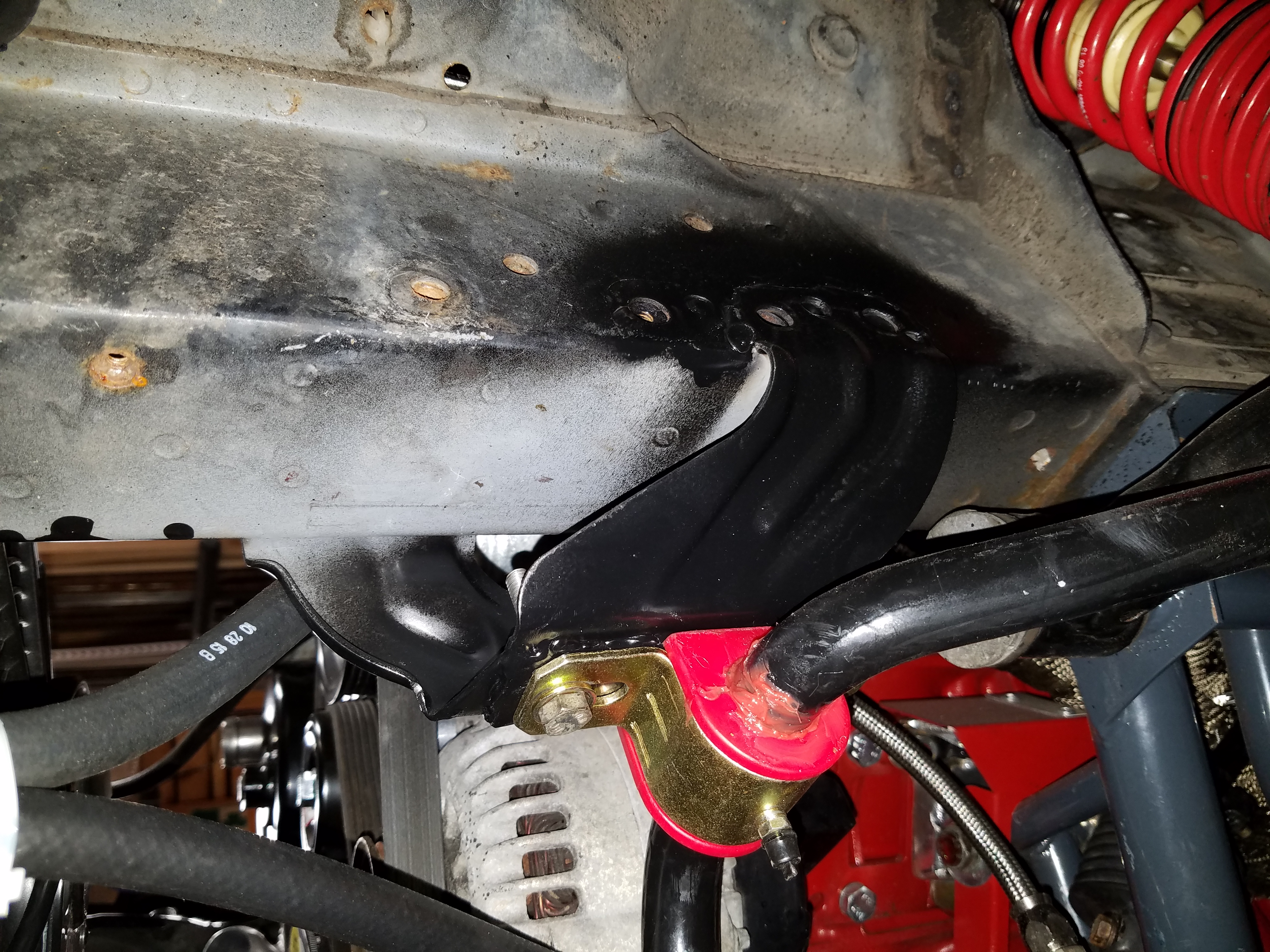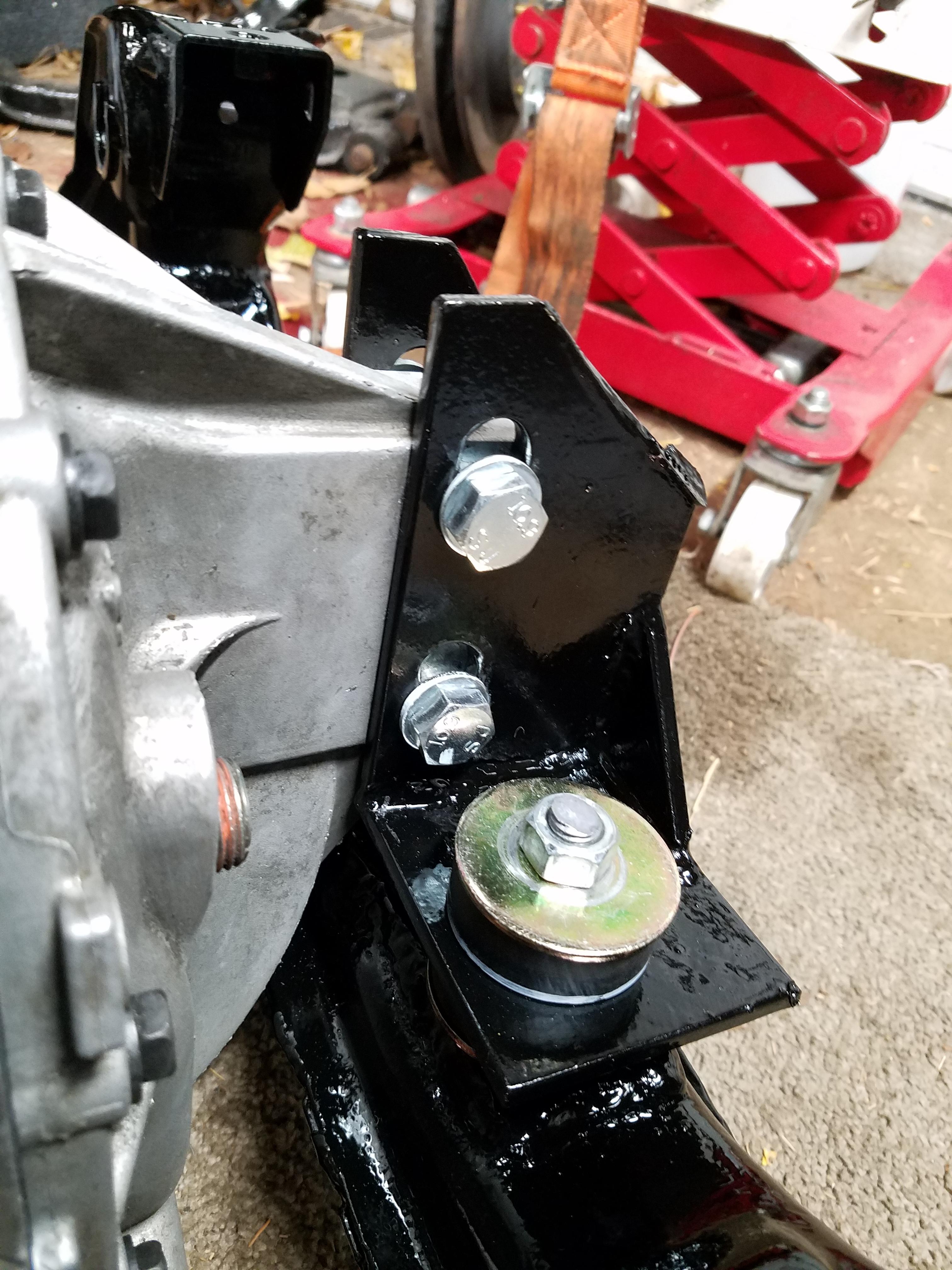 Did some rough mounting on the car. You can see where the Miata bracket front mounting bolt lines up with the rear bolt hole on the frame rail. This turned out to work fine for moving the mount back enough for the end links to be happy. Once I was happy I welded them in and gave them a good coat of paint.