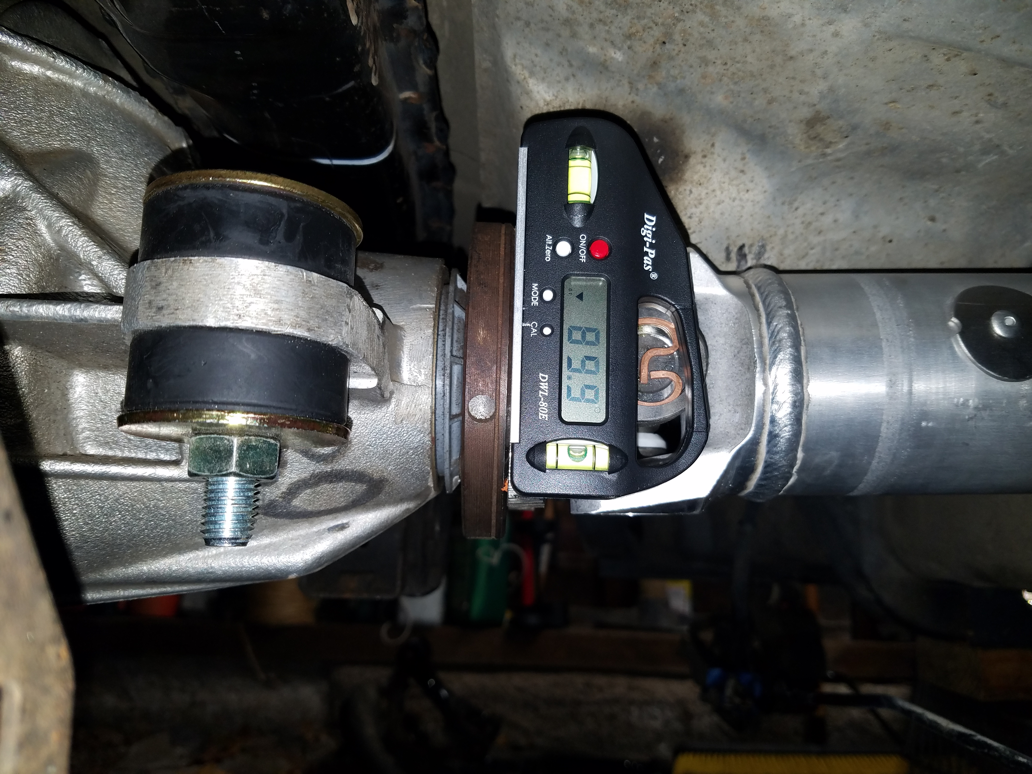 Since the angle on the T56 output was 1.5 degrees I should end up within the recommended pinion angle range of 3 degrees. The important thing is that the two angles are measure with the parts facing "down". As power is applied to the driveline it will tend to want to swing up and become more straight, or closer to 0 degrees.