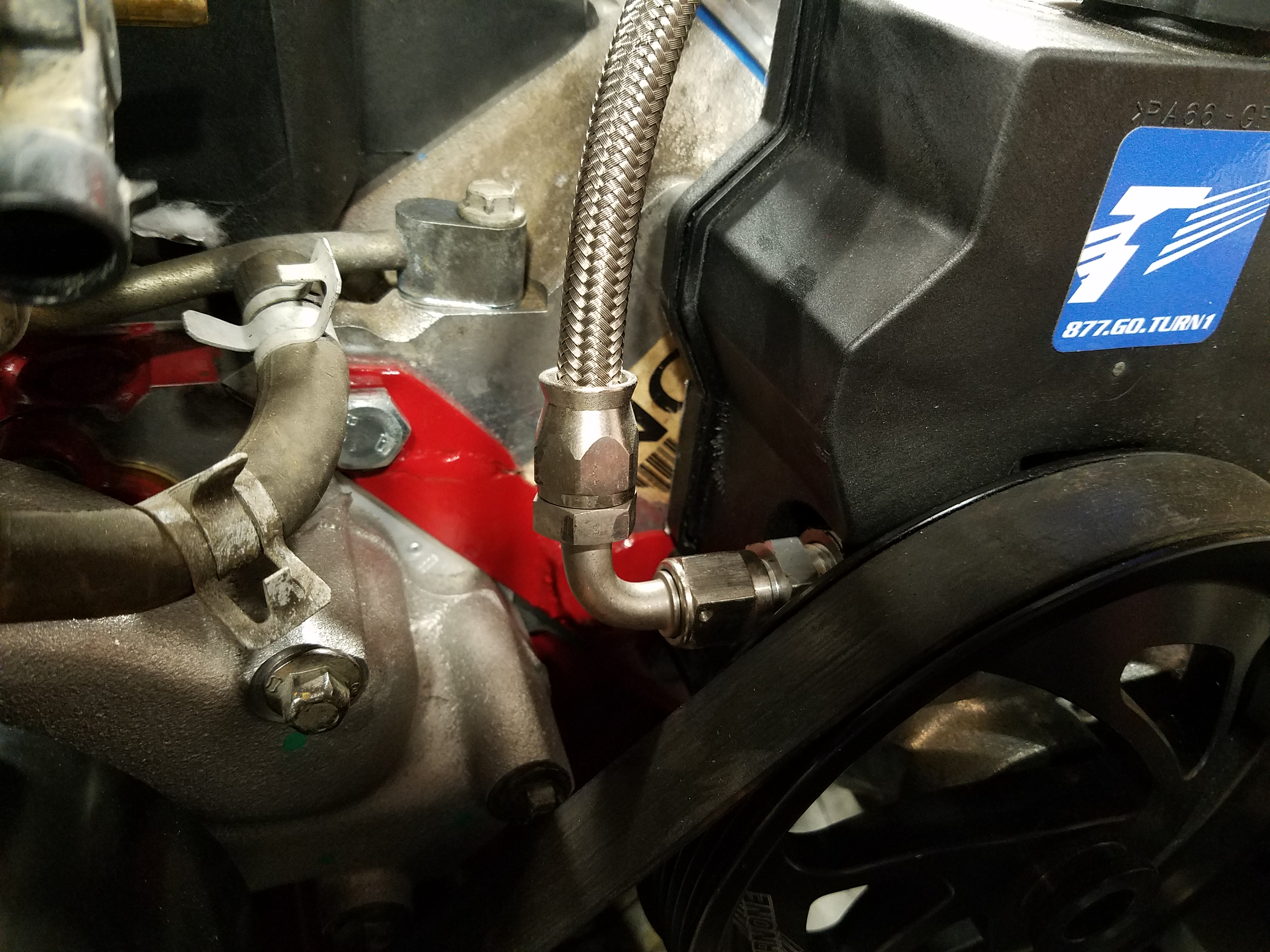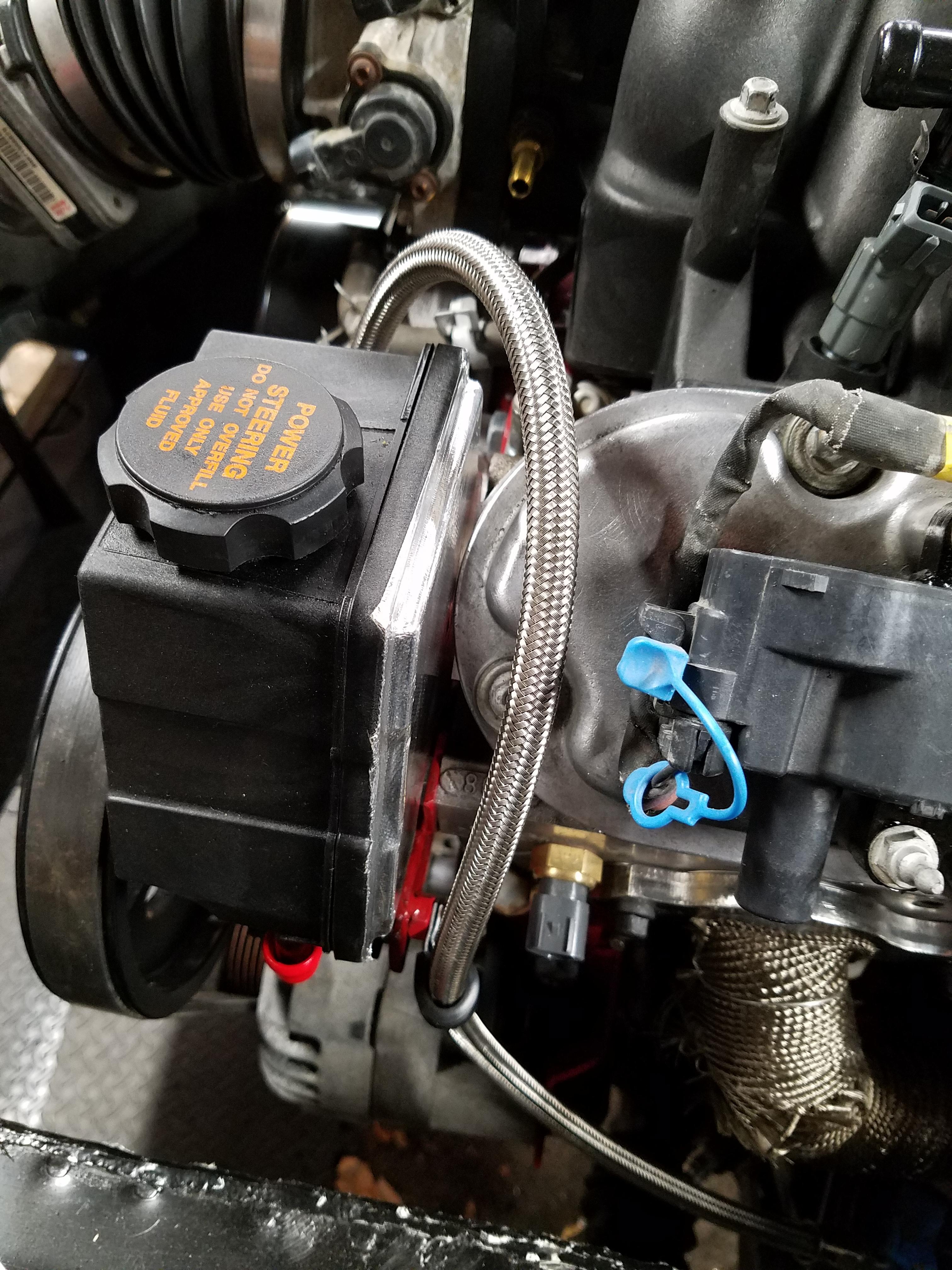 The only options I could find for power steering fittings are straight and 90 degree fittings, so this is what I did.
