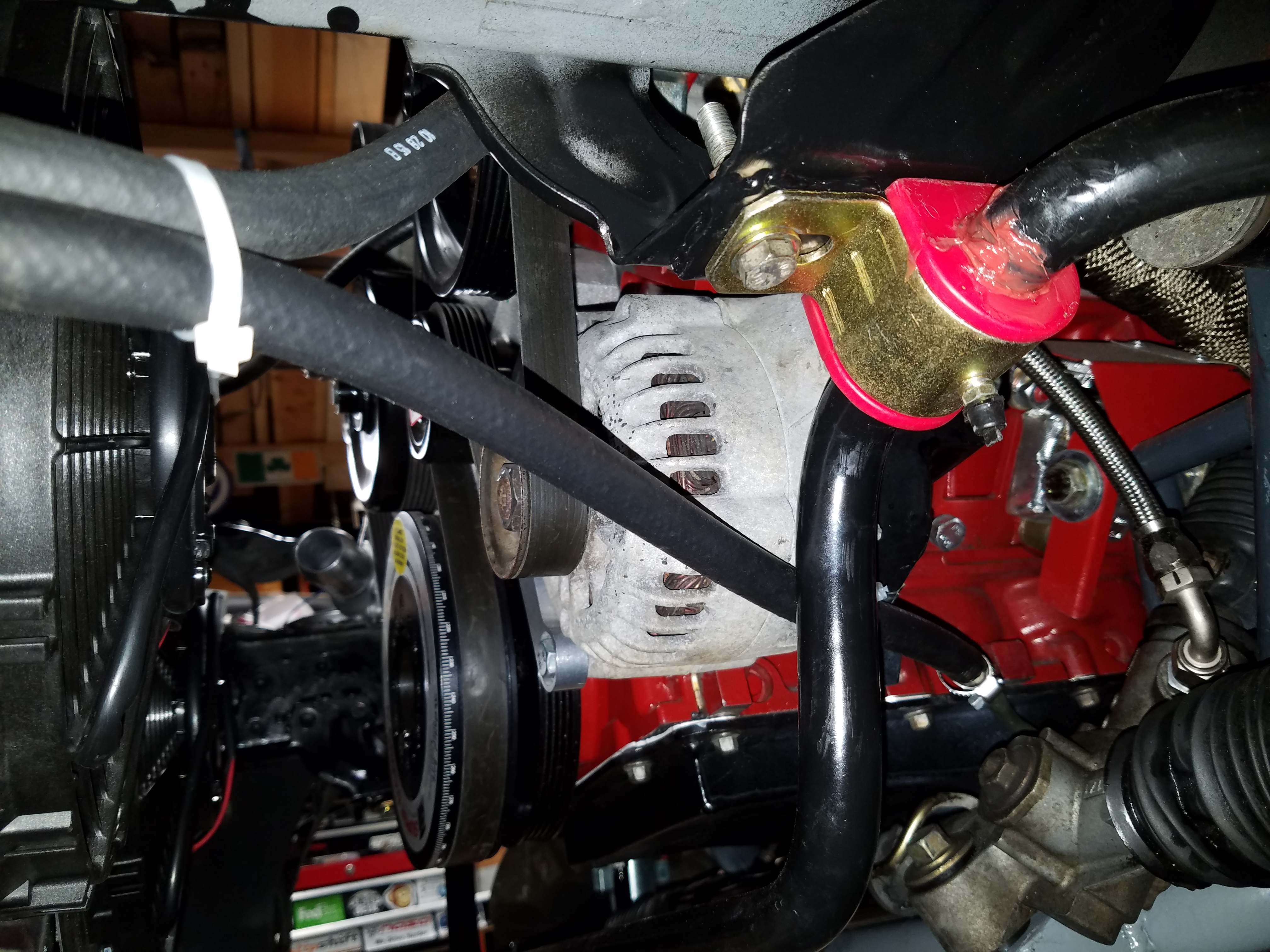 No pics of the custom lower mounts for some reason but if you can imagine some 1" wide steel strap, 1/8" thick with an L-bend at the bottom to catch the rubber mounting bumps on the bottom of the radiator. My suggestion would be to do the upper mounts first, and use something from the bottom to push up the rad into place on the upper mounts. The fit the lower mounts to the rad, and mark where you want to weld them or bolt them to the body. Then remove the rad and tack them in. Once tacked you can bend and twist them for the right fit and then weld them in permanently. Hit them with some spray paint before you mount everything up the final time.