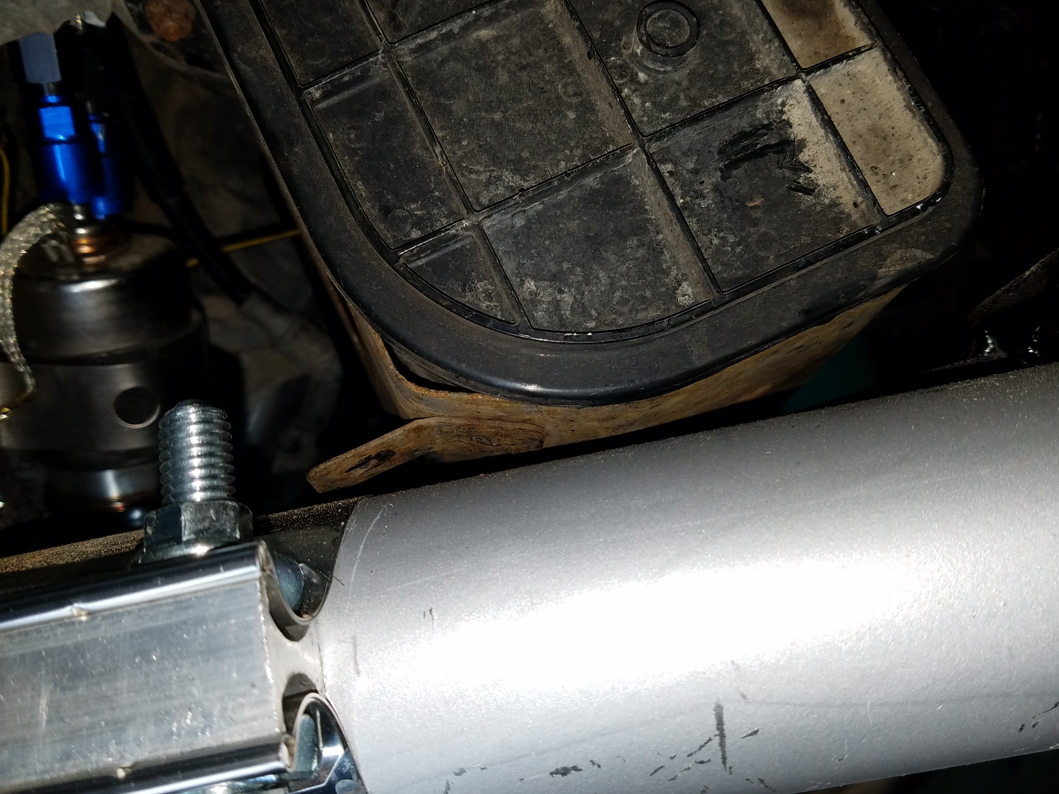 These are pretty bulky and really not in a good spot if you are trying to do a dual muffler setup. Plus I lost about a few pounds in the process. My fear was that I'd put alot of effort into routing the muffler around it, only to have rubbing or clunking from the rear in high G corners. Just some work with a grinder and big hammer to knock them out, and touched up the bare metal with some black paint. The hunk of metal removed Attachment 8702 The cutaway area Attachment 8703 Alot more room to fit this muffler or another one Attachment 8704 |