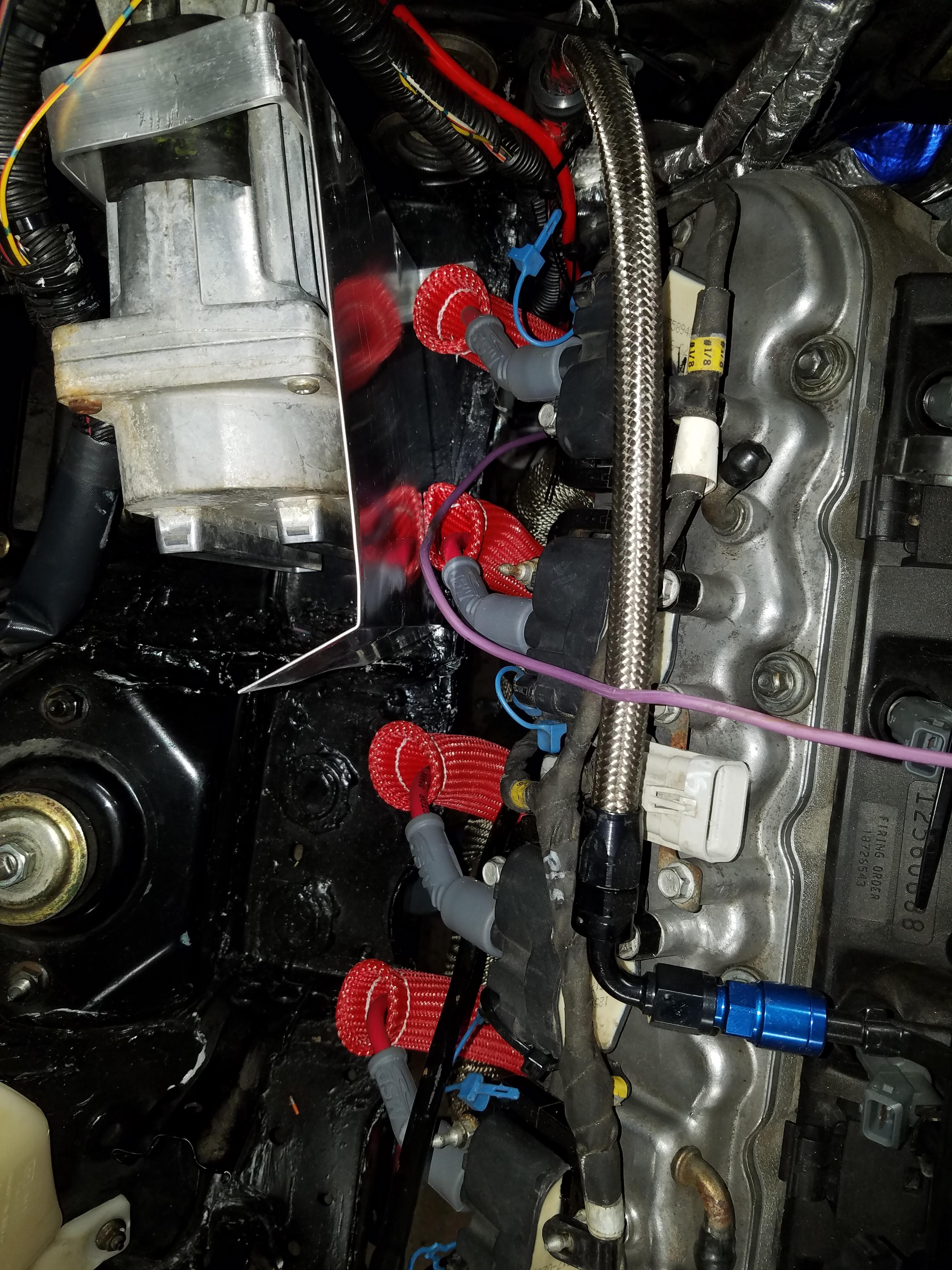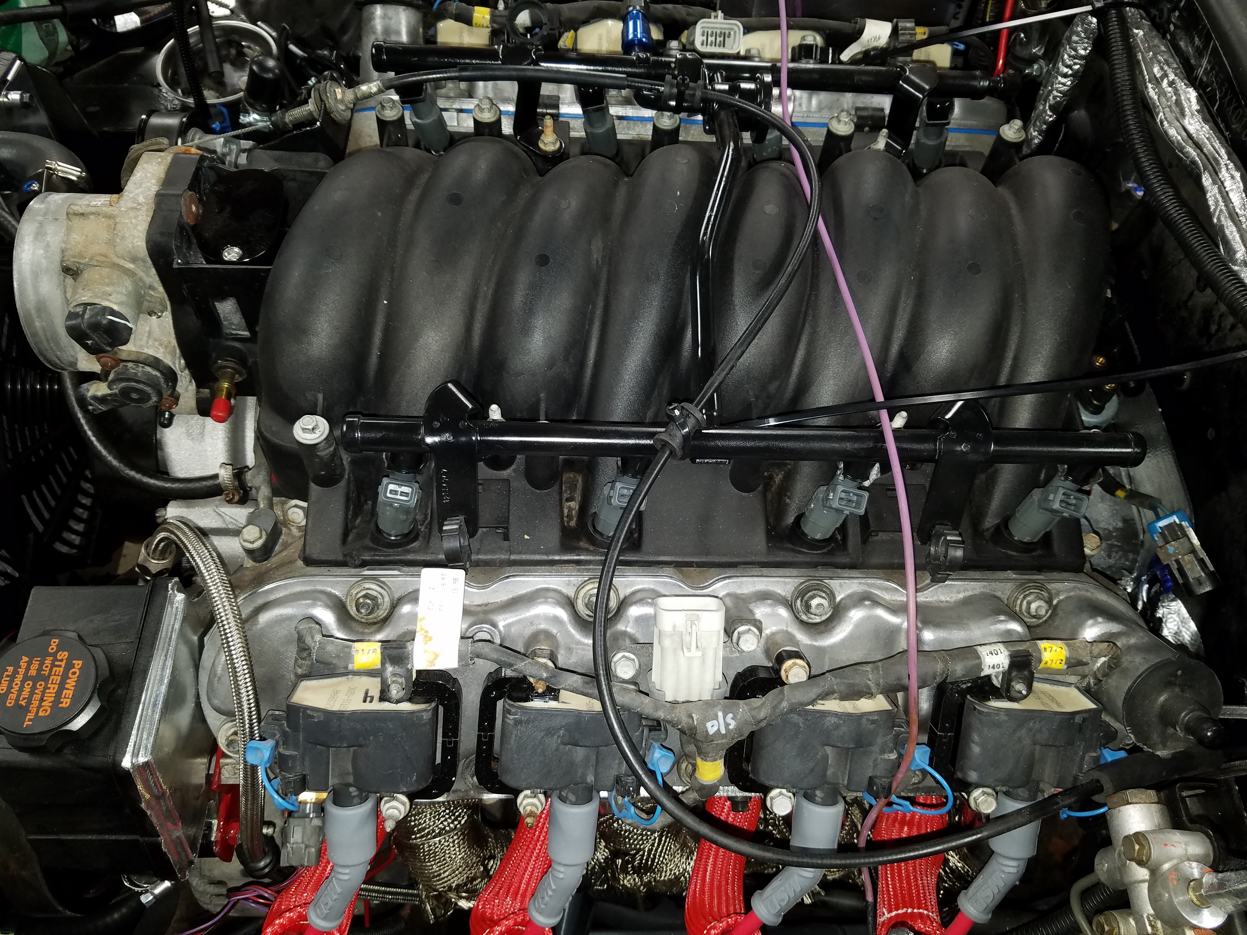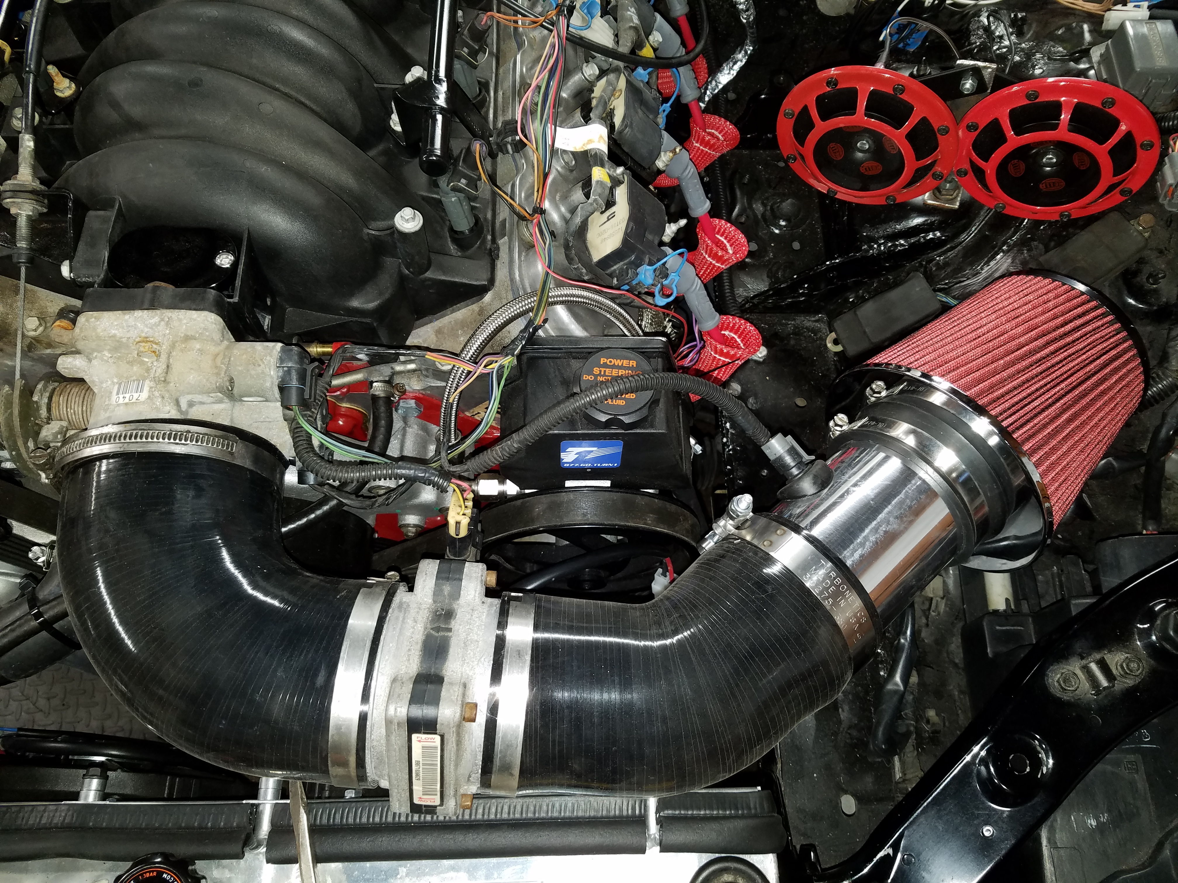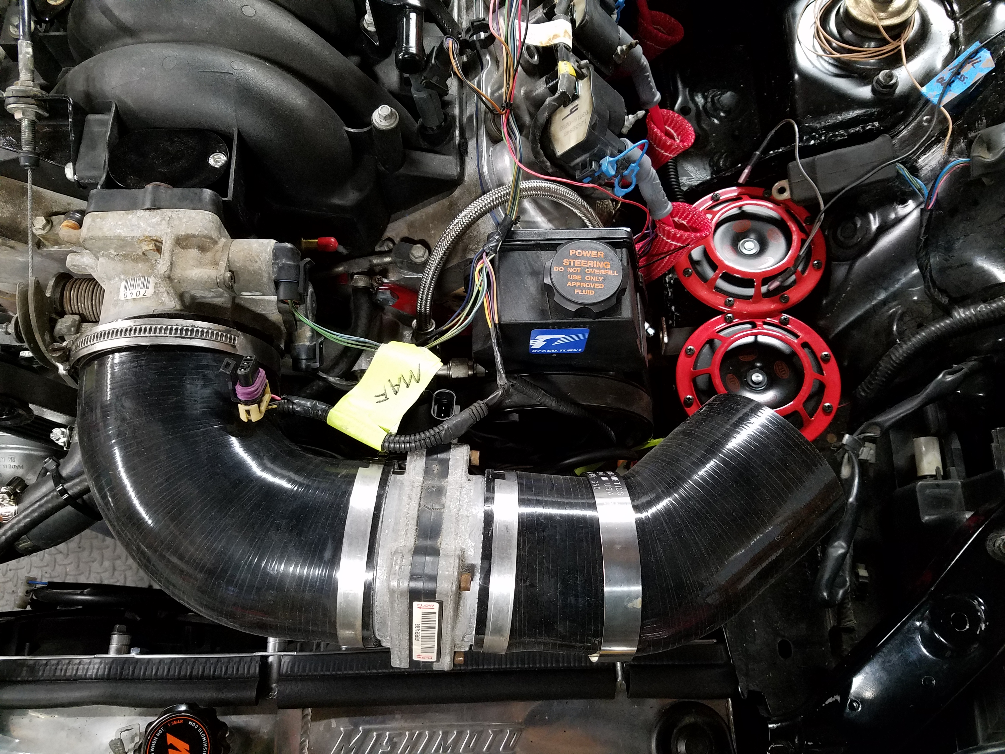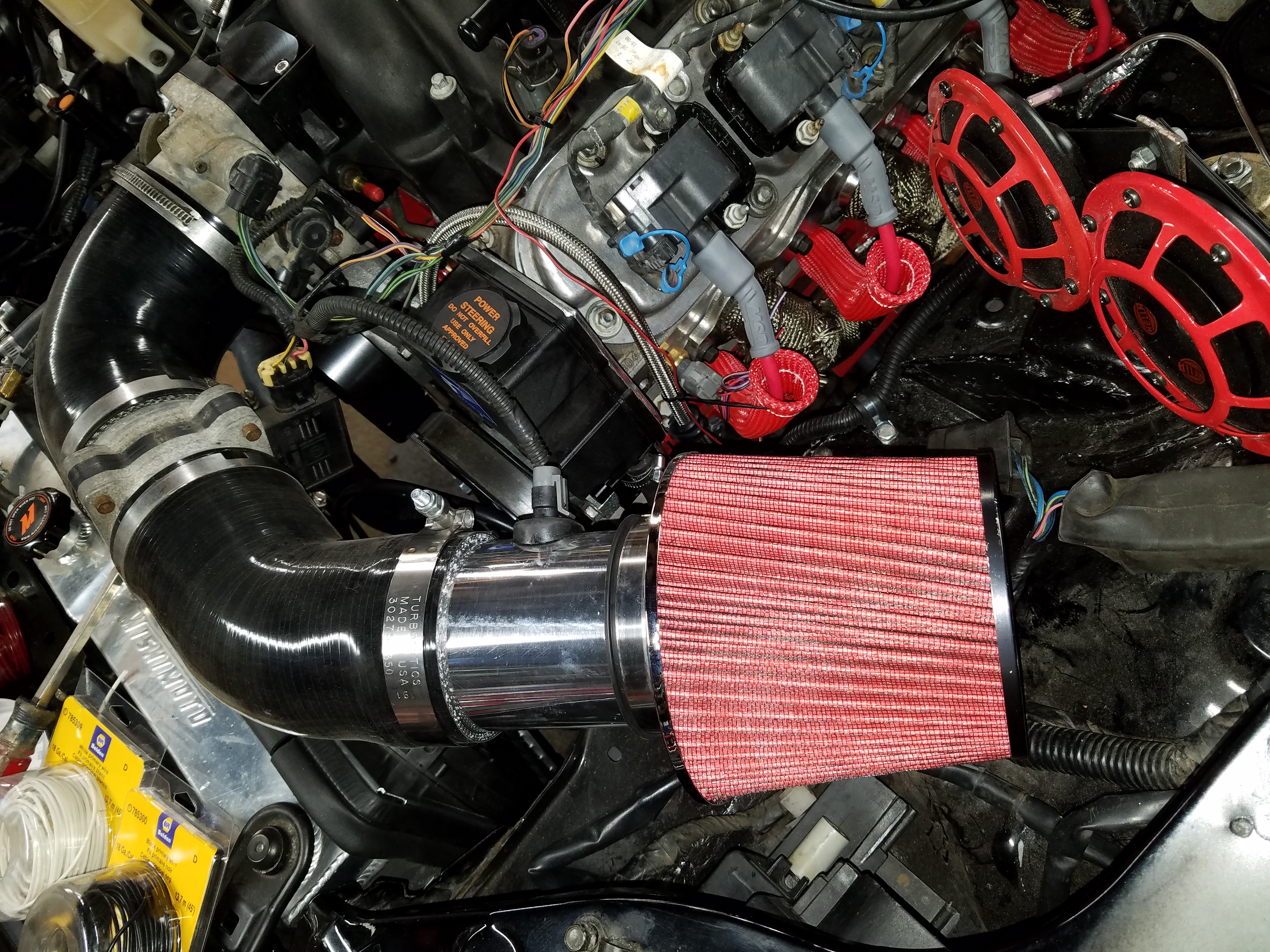 Here was my order: 1 x Silicone Reducer, 90° bend - 4.0" to 3.5" - Black (BRE000958) = $19.99 1 x 3.5" Silicone 45° Elbow, Black (SIL000408) = $19.99 1 x 1' Straight Aluminum Pipe, 3.5" (SIL000279) = $14.99 1 x Dual-Cone Air Filter - black, 3.5" inlet (AIR002008) = $14.99 You may want to measure the O.D. of your throttle body or MAF sensor plate for the right match. The 4” end of the 90° bend is not a perfectly snug fit on the throttle body, but with a hose clamp on it I think it will hold fine. Unfortunately the 90° bend was not a perfect 90° either, more like 80°. When I brought this to their attention, they refunded the cost of the $20 piece from my order. Made the total price of this kit pretty reasonable ($50 + shipping). Next challenge was to adapter the IAT (air intake temp) sensor to the intake. I picked up the correct two wire sensor and grommet from Amazon. Some later LS engines might have a 3 wire sensor or have the IAT integrated into the MAF sensor. The IAT sensor (ACDelco 213-243) https://www.amazon.com/gp/product/B000C9JQVS Grommet (Part# 14054892) https://www.amazon.com/gp/product/B00266IC06 The grommet is pretty important to create an airtight seal to the intake tubing an also space the part of the sensor so that it sits in the air stream at the right height. Fitted up the silicone bends and MAF sensor to see where it put me: Attachment 8741 After some measurements, I only needed about 6” of the 12” section of aluminum pipe to place the air filter in the right spot. Flyin Miata seems to think that putting the air filter near the shock tower works the best. I’ve got my bandsaw setup with a metal cutting blade already, which will help me down the road shortly with my exhaust system. Made some marks and cut it in half. Attachment 8742 Cut a hole in the aluminum pipe with my big step drill Attachment 8743 A hole of an appropriate size Attachment 8744 Installed grommet Attachment 8745 Installed the IAT. Needed to use the heat gun a bit on the grommet to loosen it up and slide the IAT in Attachment 8746 Attachment 8747 Final install Attachment 8748 Attachment 8749 |