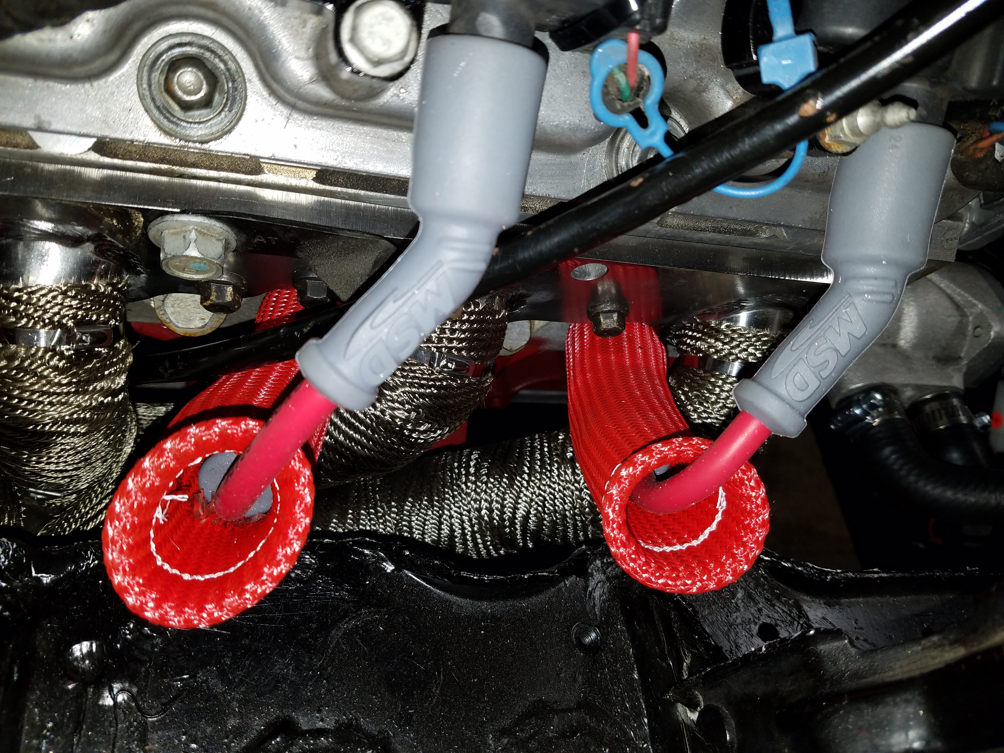Installed the MSD ignition coil wires and heat protect "booties". These were a pain as I wasn't sure the best way to install the booties - they wouldn't slide over the plugs very easily