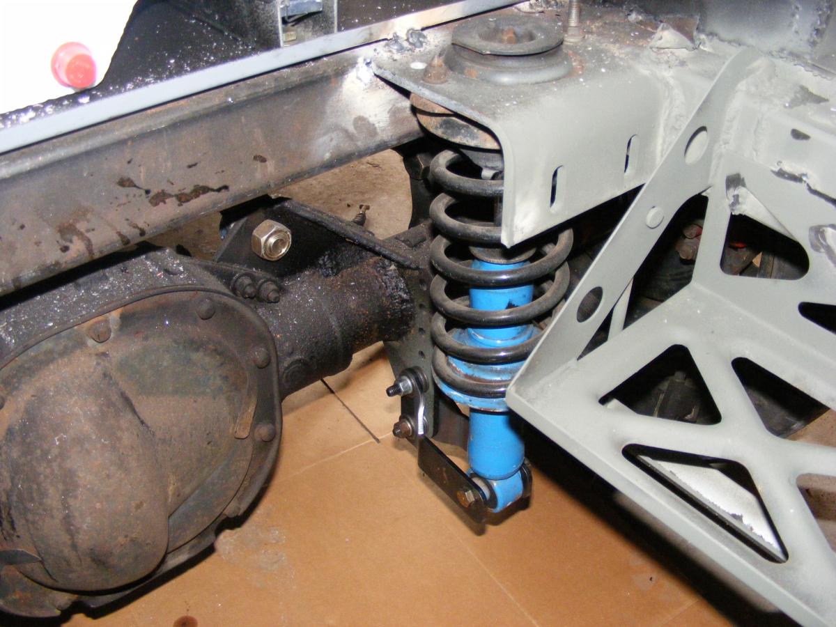 The chassis is 2x3 back halved, 4 link. 4.10 posi 8.8". 6 pt rollbar, alum. fuel cell. Drive train is an old, trusty 350 +.060, 12.2:1, roller cam. 4 bolt main, ProComp rods. 2.02/1.60 906 heads. P&P, studs & guide plates. Edelbrock airgap 2x4 w/ 9625 AFB's.