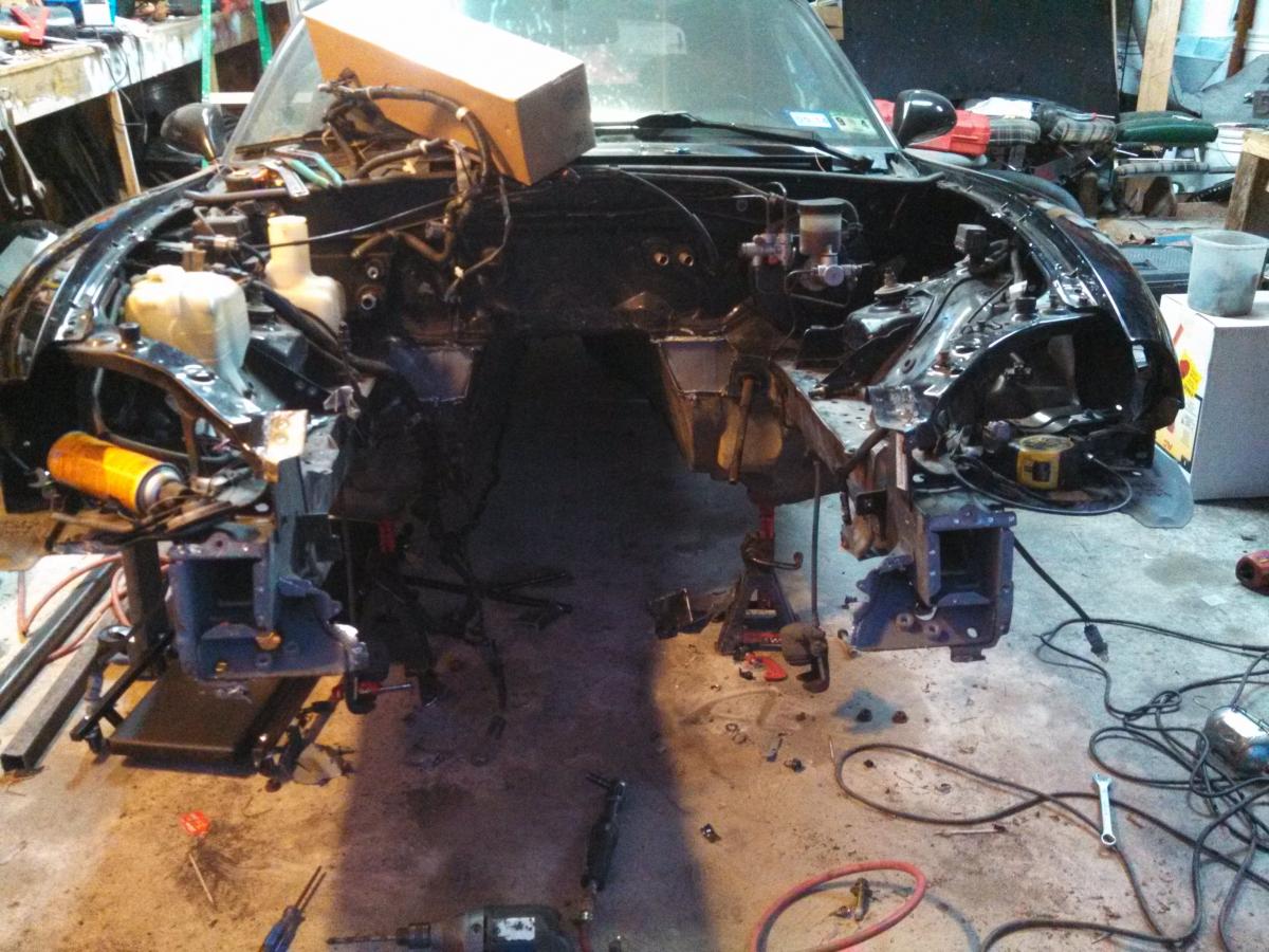 Next I took out that piece of metal that goes across the front of the car and connects both halves of the frame together. A friend of mind showed me how to drill out all of the spot welds to get the pieces out (otherwise I would have made a big mess and bent up a bunch of it)