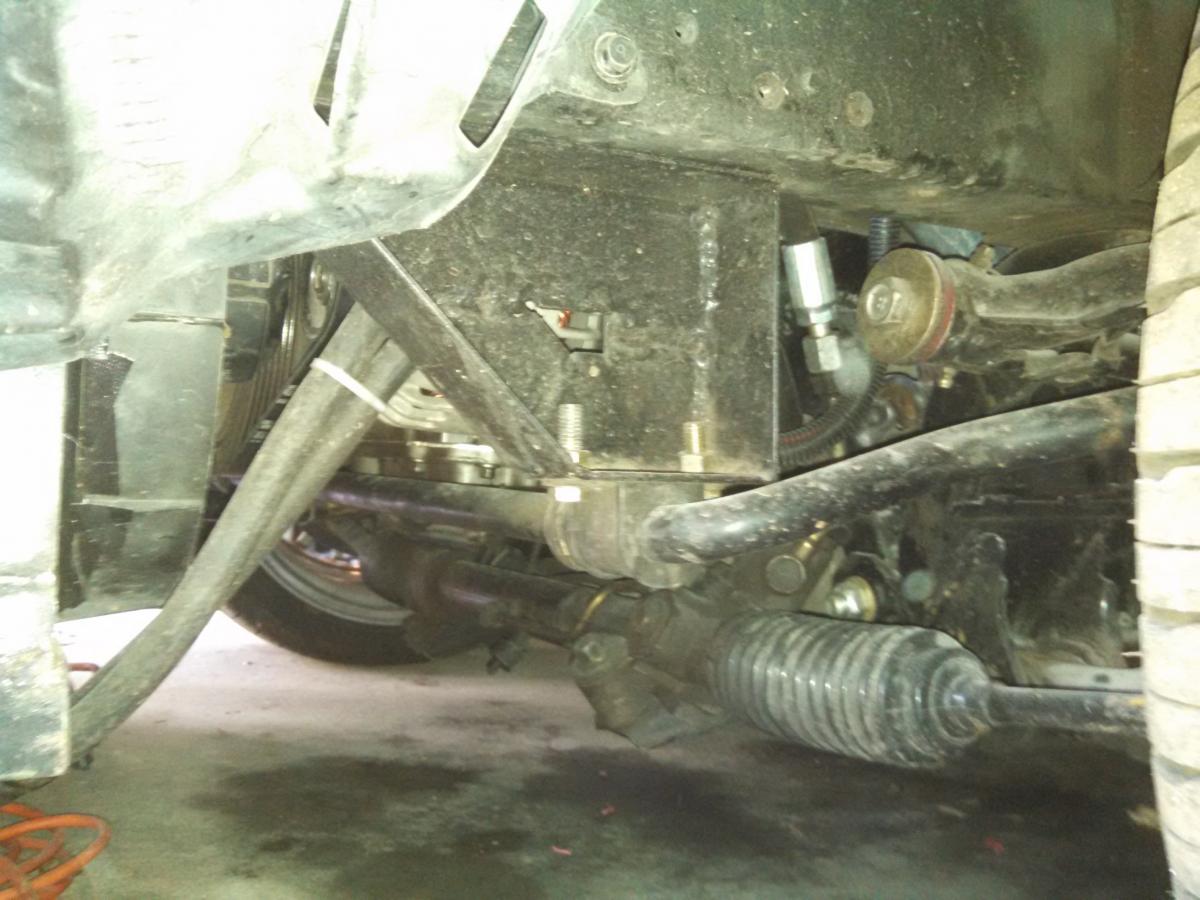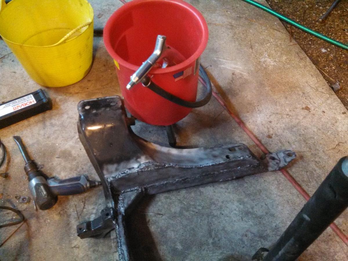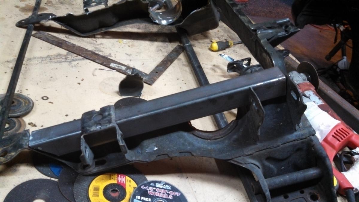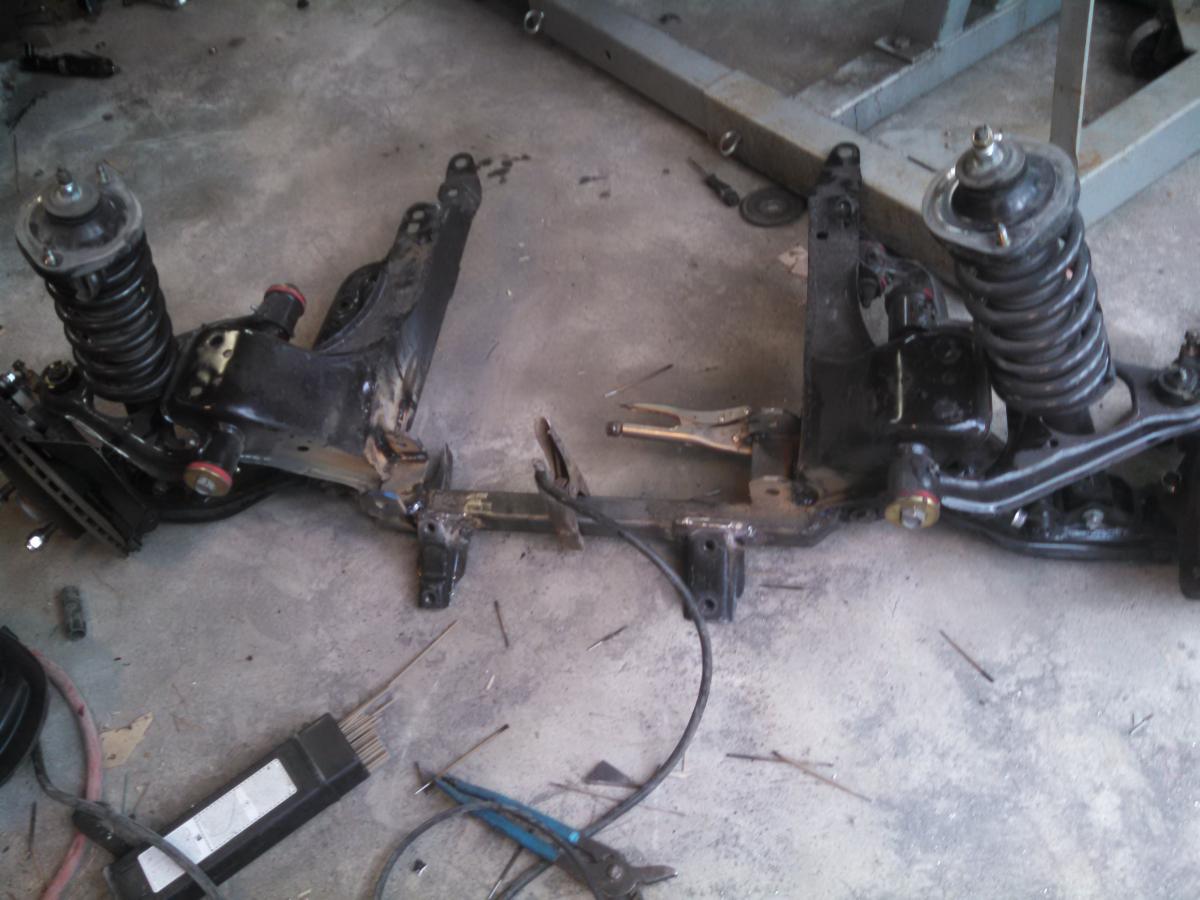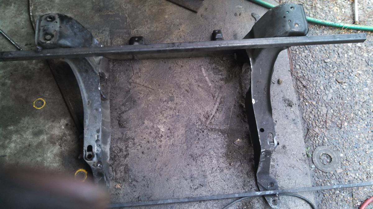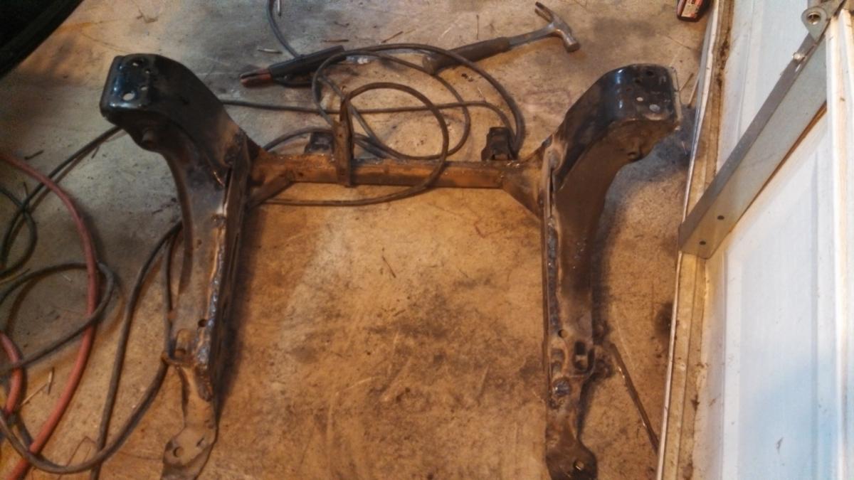 Next I whacked out the parts of the subframe that were in the way. I pretty much did what others have done. I used a 4 inch grinder and eyeballed it. Then I welded 1/4 inch thick plates to the sides. The front at this point was still in tact. I highly suggest a bar connecting both sides and don't even think about taking it off until you are done. Also....do a whole bunch of tack welds otherwise the molten metal cools then draws up and the thing won't bolt back into the car. I learned the hard way and had to get a winch on it, ungrind some welds and re-weld parts of it.