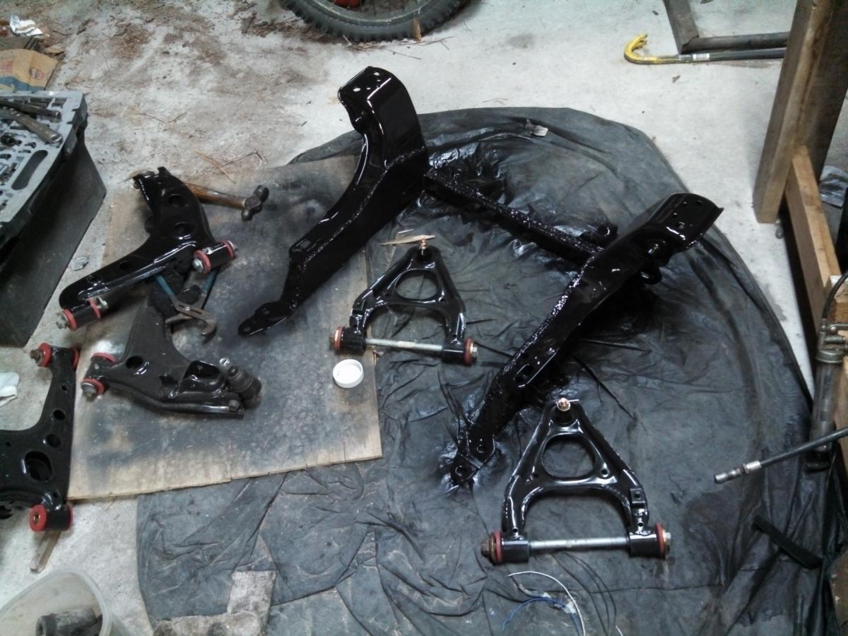 We sandblasted and painted the front and rear subframes and control arms while they were out of the car. I used black glossy engine paint. I didn't want heat to be an issue and a paint and body guy told me that it was a better grade paint vs the other rattle cans.