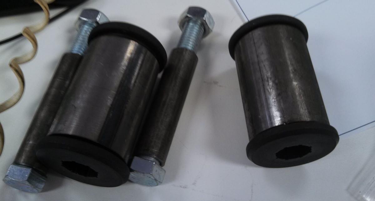 Next I cut some pieces of 1 1/2 tubing and some pieces of 2 inch tubing. I removed the polyuretane bushing and did some welding. The 1 1/2 inch tubing at this point slid inside the 2 inch tubing. I did it this way so I could jack the motor up or lower it down to get it just right.