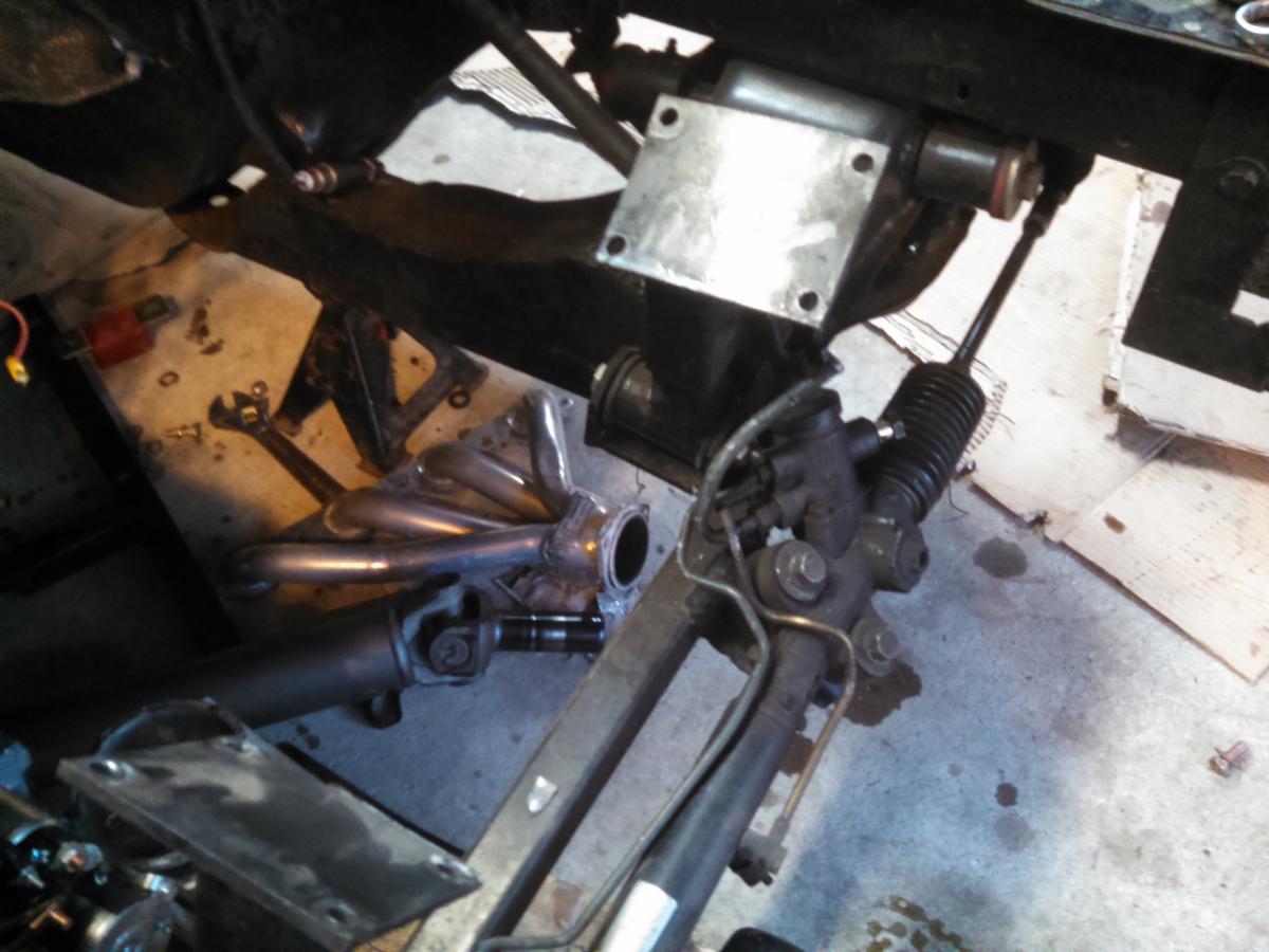 I later replaced that weak looking stock piece of metal across the front frame with square tubing. I think it is much stronger and looks a lot better. Notice that the mounting brackets for the steering rack are welding on the square tubing. They are at the exact location they were before......I later moved them a little toward the drivers side so that my steering shaft would clear my headers. I didn't want to "dimple" the header and decrease flow. That made the car turn very sharp to the left and not so well to the right so I lengthened the right tie rod end and shortened the left one. That was fun. Shortening the left one required me to grind some metal off it to get it the right diameter then running a die on it to get more threads and cutting off about 3/4 inch that needed to be gone. I cut the right tie rod in half and welded a 3/4 piece of material into the void. I cut a groove into all pieces so I would get good weld penetration after welding all of the pieces together I clamped a 1/2 inch piece of angle iron across it and welded it up like a splint. If you do this, don't forget to put the rubber boot on first because it won't go over angle iron after the fact and keep some water there to cool the parts and weld in short segments otherwise your rubber boot will melt.