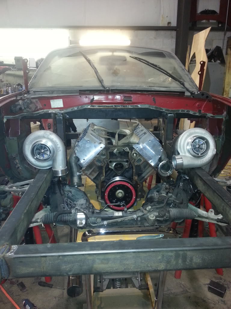 Gonna do some more tomorrow. Finish mounting front sub frame. Triangulate the front rail to the upright. I set the turbos on the rails just for the pure excitement of it. This thing is gonna be wicked! http://i1278.photobucket.com/albums/...ps18fe7c0d.jpg