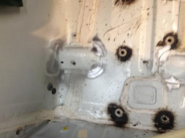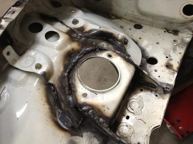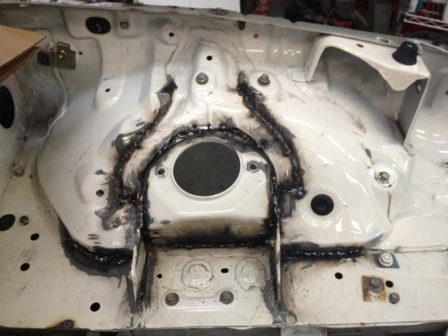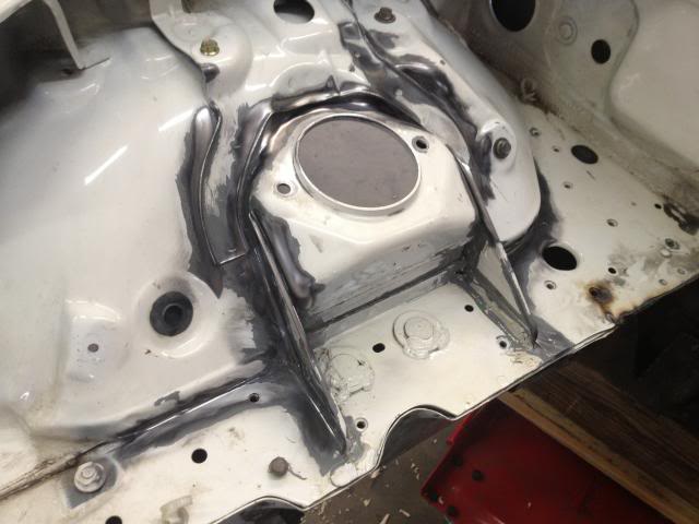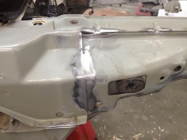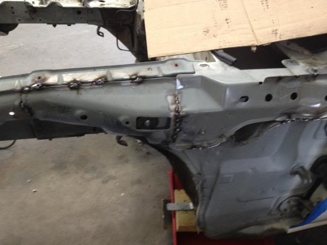 Next up -- I had a slow day in the shop with some repetitive country music on the radio and decided to make the full plunge to 1. Play with a mig welder (I'm not claiming that I can weld -- I can turn it on, make a good ground, and strike an arc and burn some wire -- not weld like a lot of talented V8 conversion folks.) 2. stitch weld/ seam weld the areas that are known to stiffen up this unibody. I have the unique opp to do it NOW with everything removed. Plus no V8R oil pan as of yet so I cannot start test fitting the bellhousing clearances as of yet.