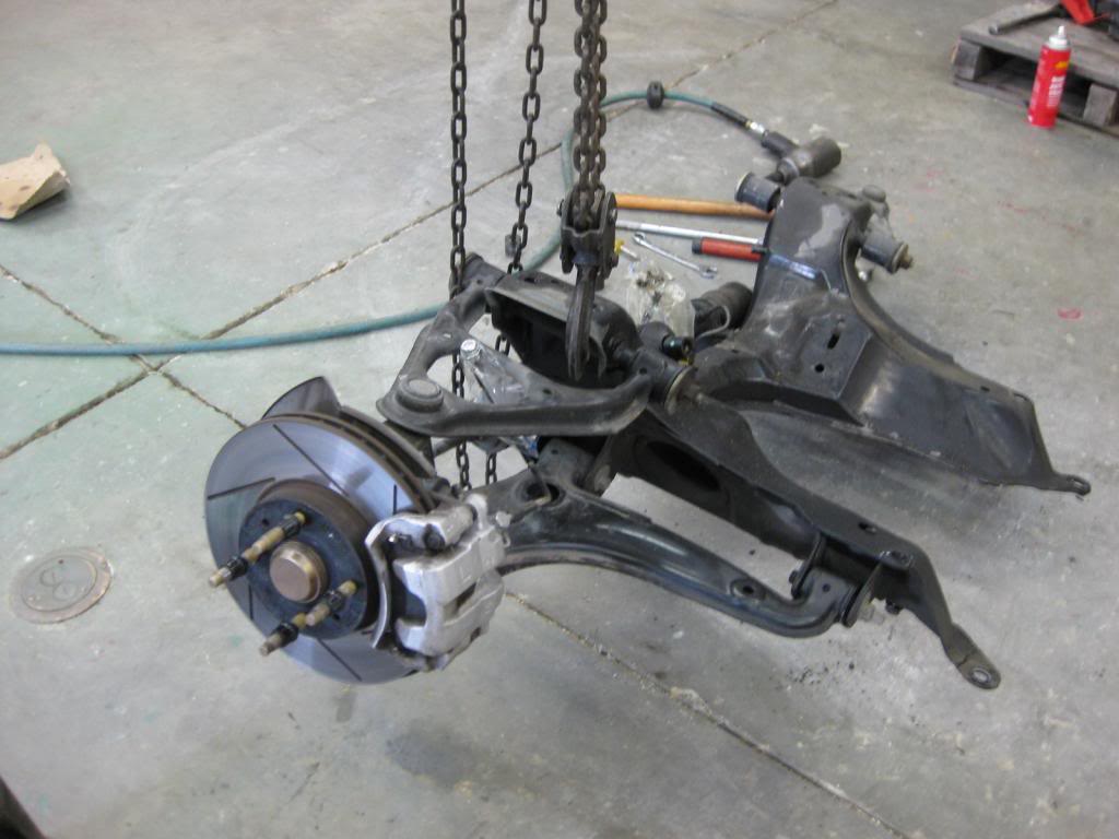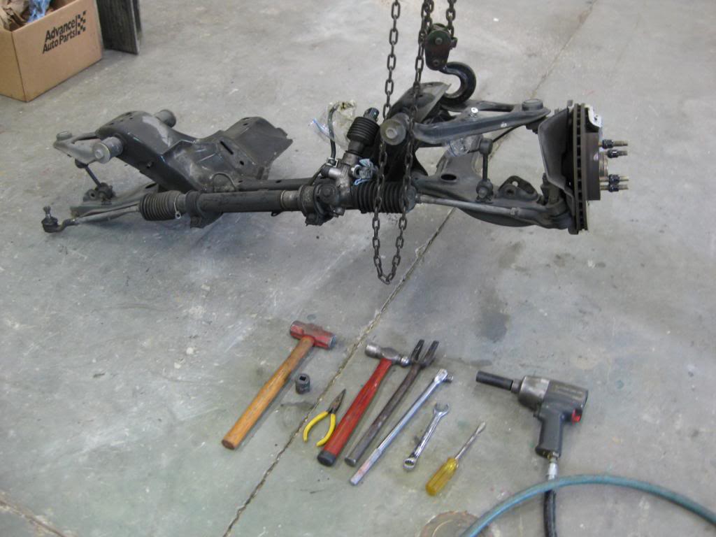 Today was a dirty-job day with a few different tasks. 1 was to disassemble the old Miata front K member and suspension. Wanted to extract the front uprights/ hubs and remove the shocks & springs. The fun part was finding a pickle fork and whacking it with the 2-1/2# hammer to separate the ball joints. While doing that, I went ahead and stripped it apart with removal of all the A arms and stuff.