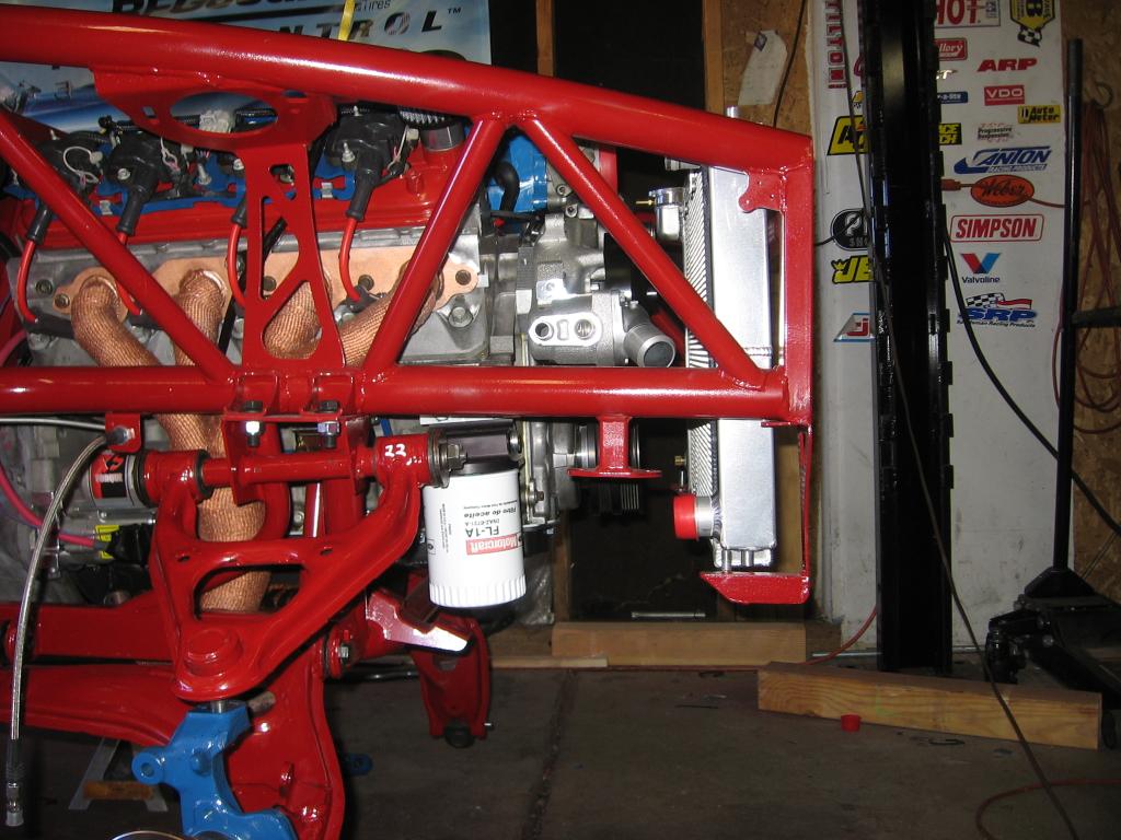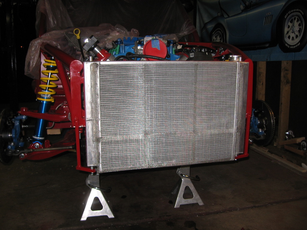 I ended up remaking all the front frame brackets, and buying a new thinner radiator from V8R. Then I had to have the radiator modified, with new outlets. V8R, if you're listening, install these outlets in the beginning.