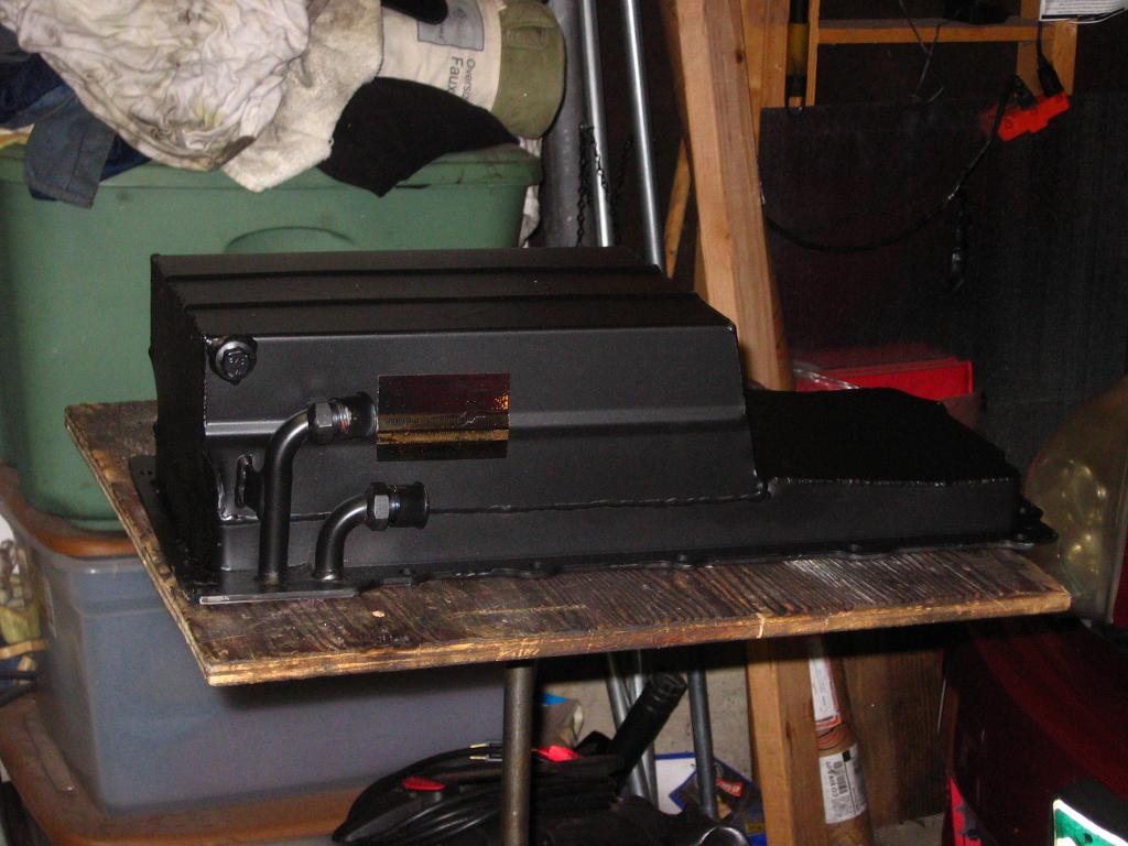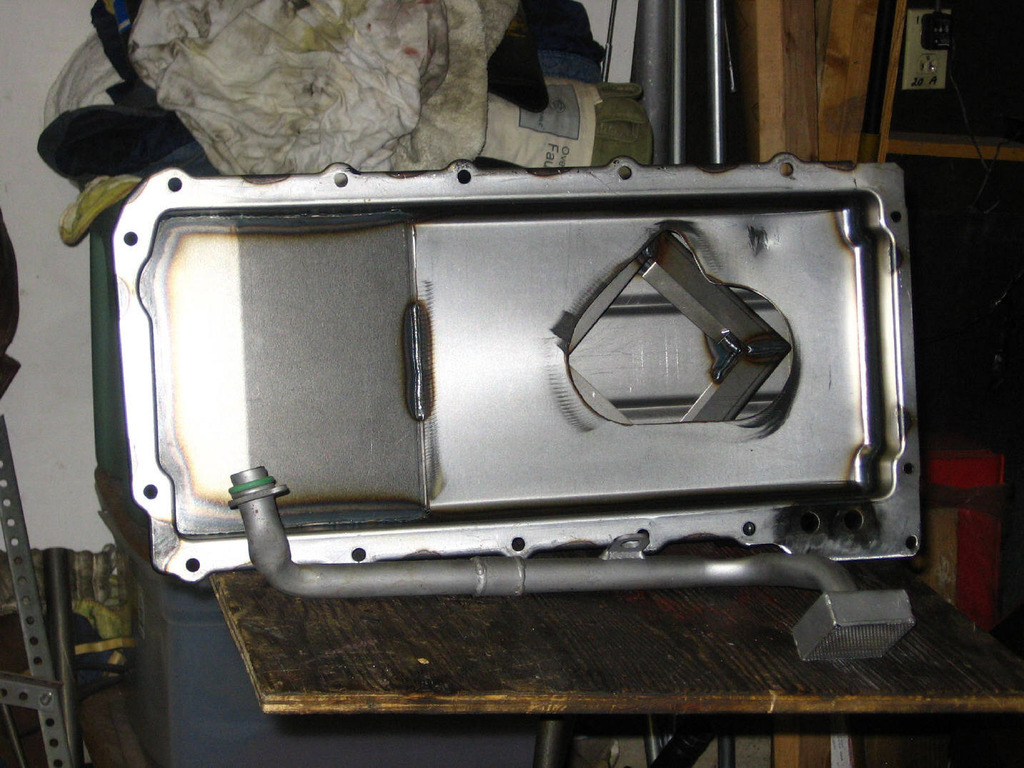 The oil pan is from V8R. I originally wanted the aluminum part. Mostly because it would keep the oil filter in the stock location. The the folks at V8R recommended the steel pan. It's cheaper, but it has better baffling for road racing.
