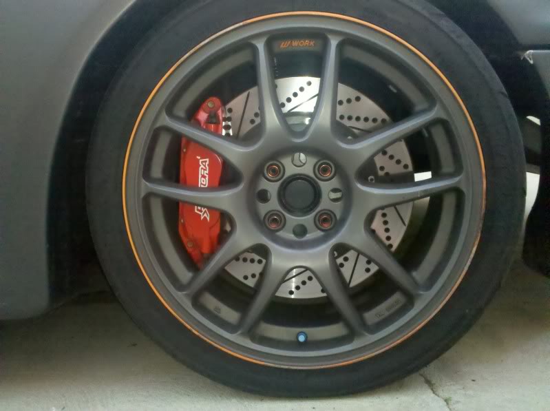 Also, if your really feeling froggy, .Ill consider selling the rims with the brakes so youll be able to rock these bad mamma jammas. Rims are 17" Work Emotion CR Kai. 4x100 bolt pattern. Not sure of offset, but all 4 are identical. Uses a good sized spacer in the back to make them flush like they are. All 4 rims have some mild curb rash. Could be repaired or covered up if you redid the pin striping on them. Never bothered me. Front tires are DZ101s and the rears are 615ks. All with good life.