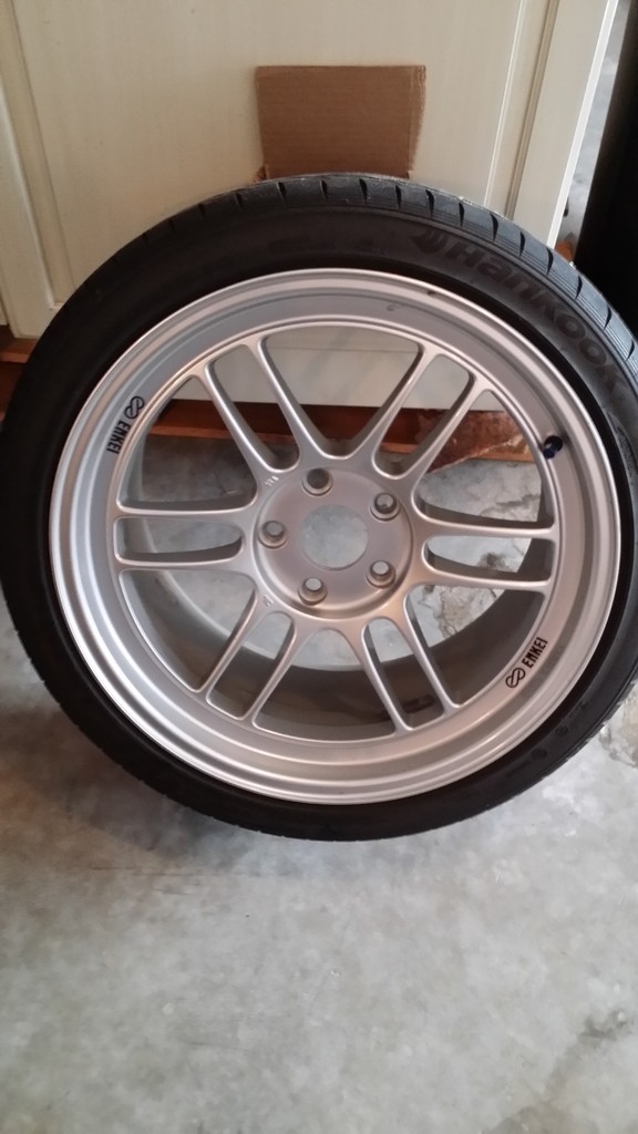 4 new Enkei 18x9.5 RPF1 wheels with proper lugs and wrench! (45mm offset 5x114) already mounted and balanced on new Hankook V12 Ventus evo K110XL, 255/35ZR-18 fits 2006-2015 Mazda MX5 Miata and (?), might separate rims from tires??? 17.4 pounds for 9.5 inches wide, Includes Enkei Aluminum Valve Stems. PERFECT! Asking $1800.00 or reasonable offers.