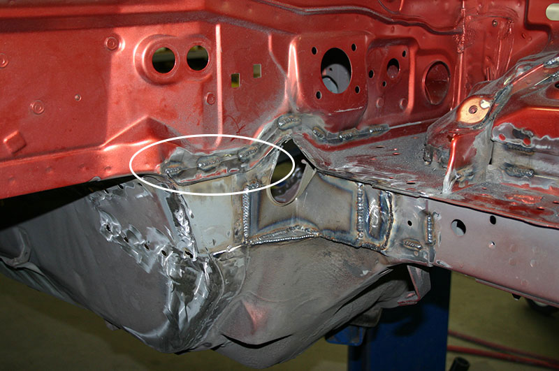 This picture kind of proves my doubts about the whole "seam welding" theory and how people do things for no real reason at all. Look closely. They seam welded a seam that doesn't do anything (white circle). It's a seam that was there to support a piece that they had already cut off. If they wanted to weld something there, they should have removed the piece of useless left over metal and seam welded the real seam hidden under it. (on a side note, I wish my welds looked that good).