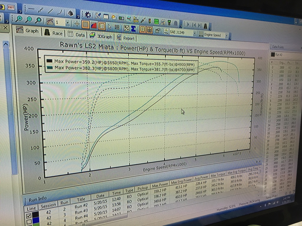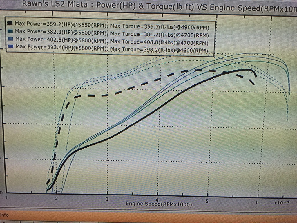 I target 13 to 1 or 13.1 to 1 under full throttle. A lot of people will argue that is too lean and 12.8 is a better target. I see the Miata more like a motorcycle when it comes to tuning.It is very light so it doesn't load the engine nearly as much as , say, a Camaro or Mustang or Challanger that weigh close to 1500 lbs. more. The rate of change of rpms is pretty quick in such a light car. For timing it looks like 26 to 28 degrees is about where you end up. For comparison my stock bore LS1 with V8 Roadster long tubes (Kooks) and a .565 lift cam with 332 duration on a 114 seperation made 392 hp and 386 lb/ft. The headers were good for 26 lb/ft over the smaller swap headers that are out there.Attachment 1643
