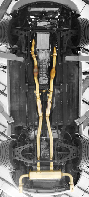 Full exhaust from ports to tailpipe. All stainless steel, metallic core cats, custom built muffler with internal crossover. Designed for use with cars using the V8R swap kit and an LS engine and Getrag diff.