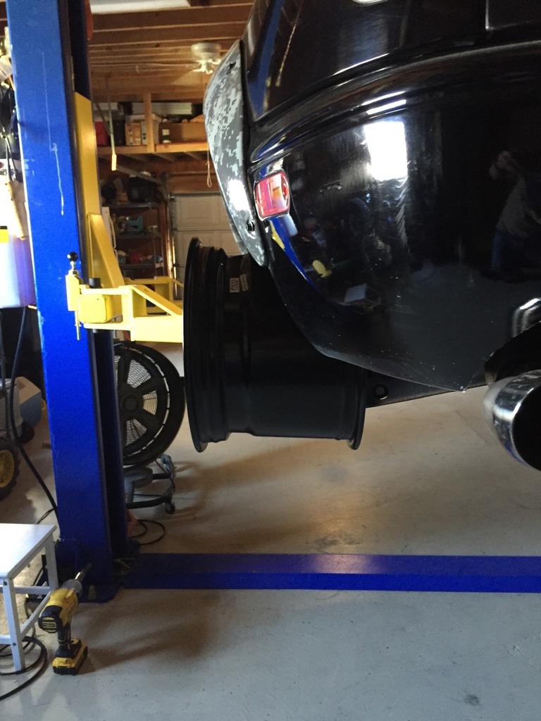 These pics are still with my 1 in spacer on the rear. As of now I measure 2 in to the springs and 1.25 in outside the flare. When I take off the spacer, the 275 should roll in there really nice. HOPEFULLY. Time to bite the bullet and pony up the cash for the tires.