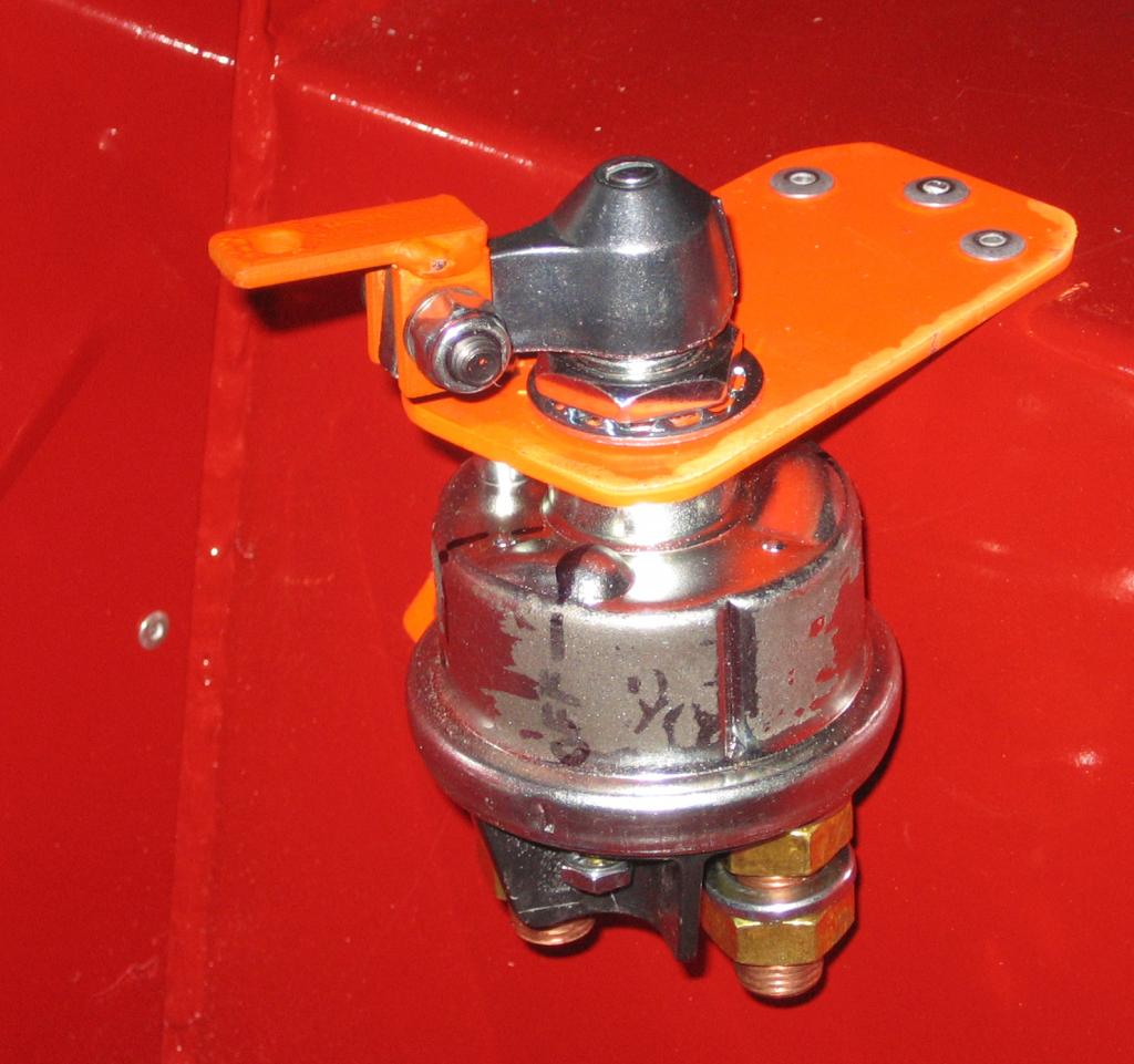 Obviously, the main battery switch will be right next to the battery. I attached an extension handle, and then I'll attach an actuator handle leading up to near the gear shift where I can reach it. I painted the battery switch plate and the handle safety orange, for obvious reasons.